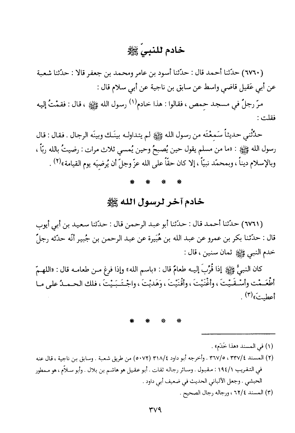 (٢) المسند ٤/ ٣٣٧، ٥/ ٣٦٧. وأخرجه أبو داود ٤/ ٣١٨ (٥٠٧٢) من طريق شعبة. وسابق بن ناجية، قال عنه
