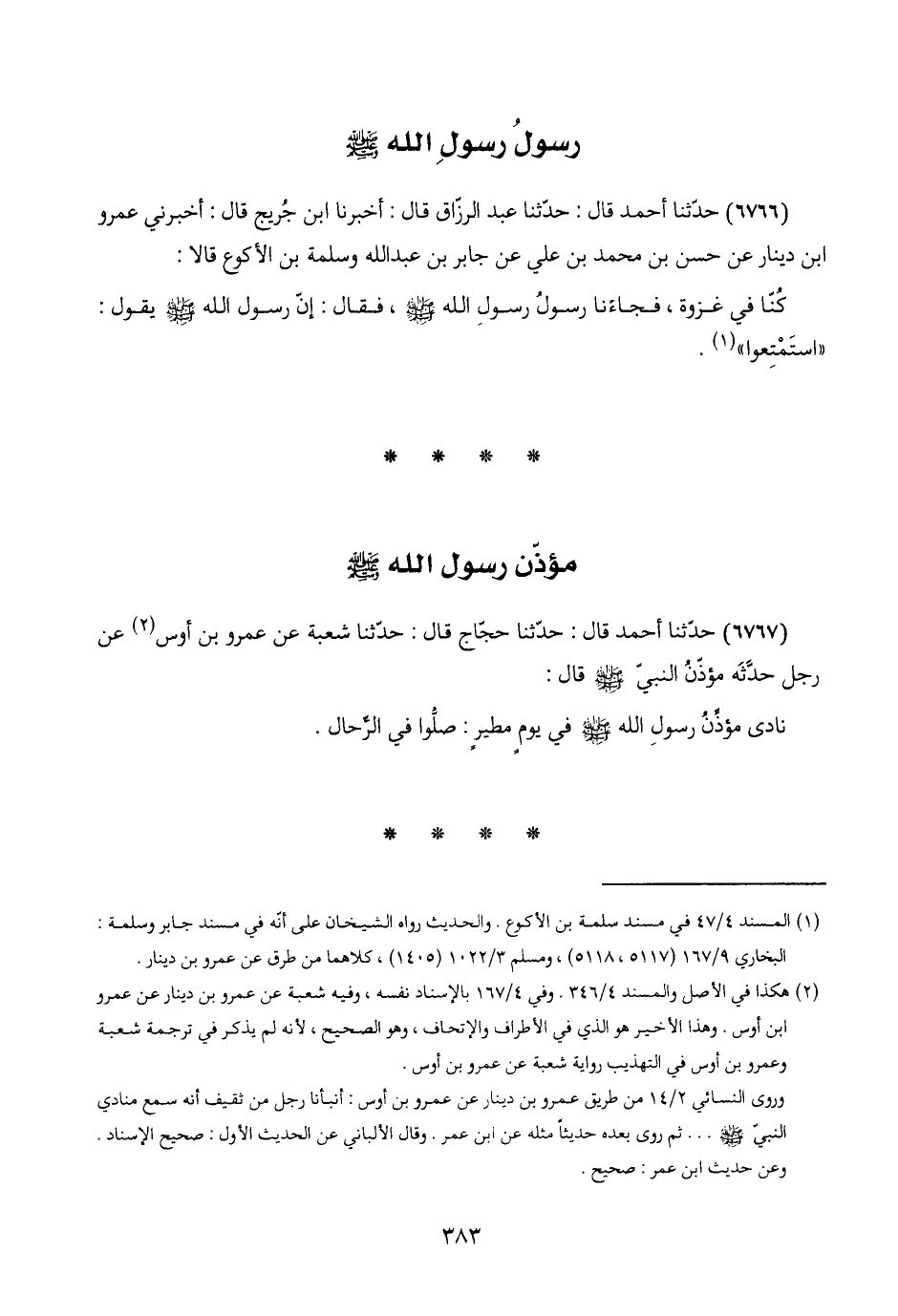 (١) المسند ٤/ ٤٧ في مند سلمة بن الأكوع. والحديث رواه الشيخان على أنّه في مسند جابر وسلمة: