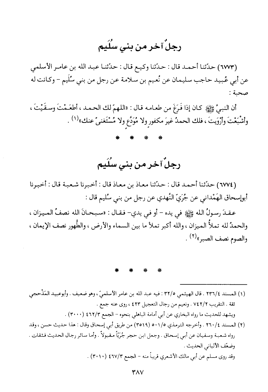 عن أبي عُبيد حاجب سليمان عن نُعيم بن سلامة عن رجل من بني سُلَيم - وكانت له