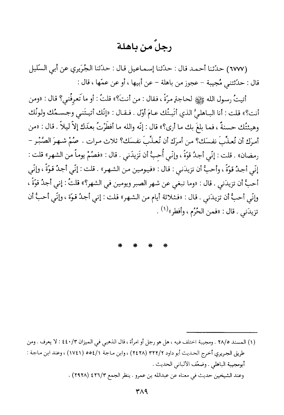 (١) المسند ٥/ ٢٨. ومجيبة اختلف فيه، هل هو رجل أو امرأة، قال الذهبي في الميزان ٣/ ٤٤٠: لا يعرف. ومن