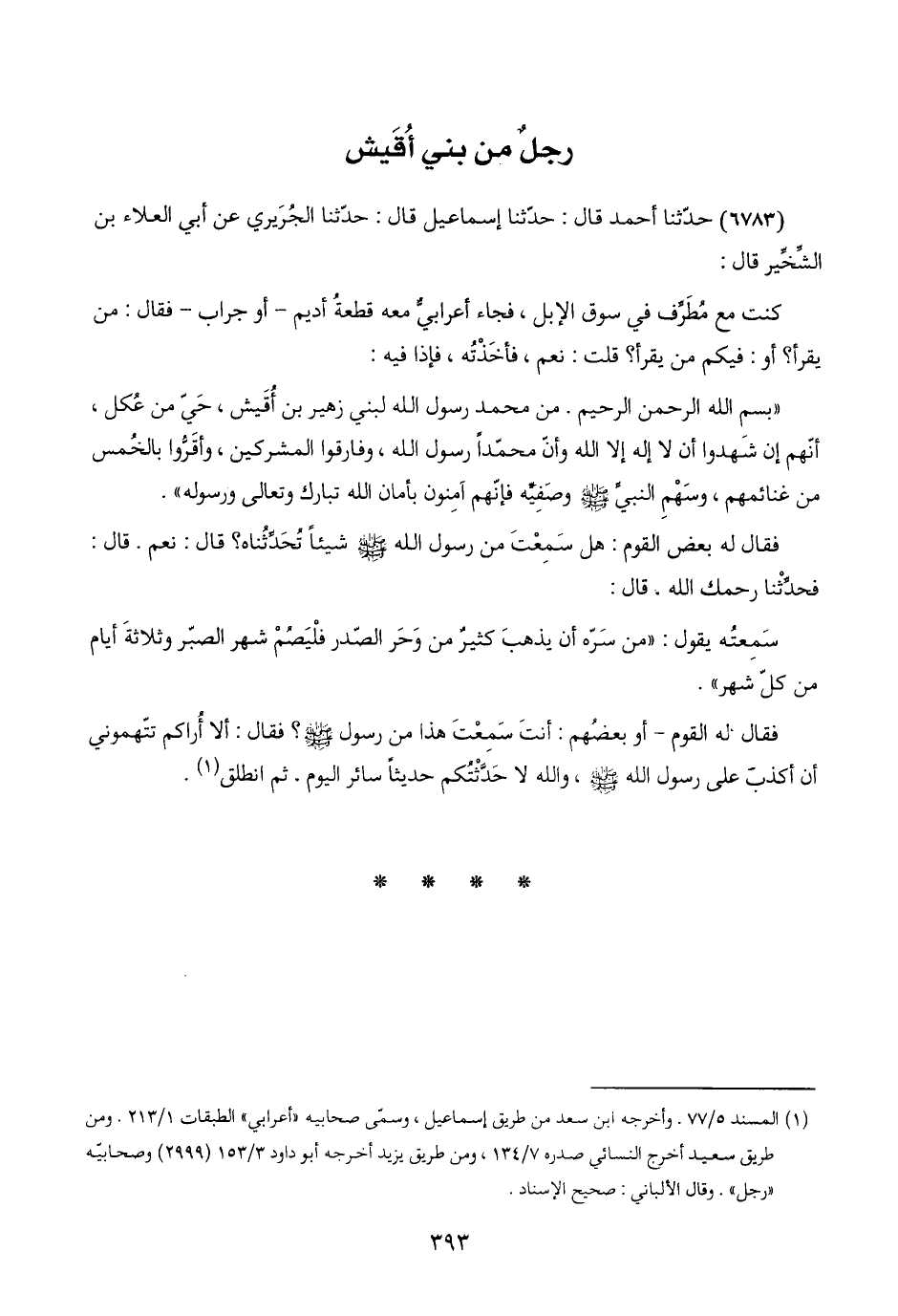 (١) المسند ٥/ ٧٧. وأخرجه ابن سعد من طريق إسماعيل، وسمّى صحابيه "أعرابي" الطبقات
