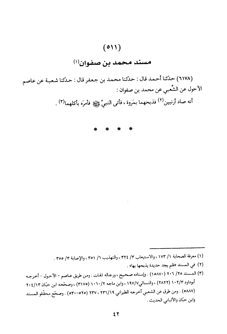 (٦١٧٨) حدّثنا أحمد قال: حدّثنا محمد بن جعفر قال: حدّثنا شعبة عن عاصم الأحول عن الشَّعبي عن محمد بن صفوان:
