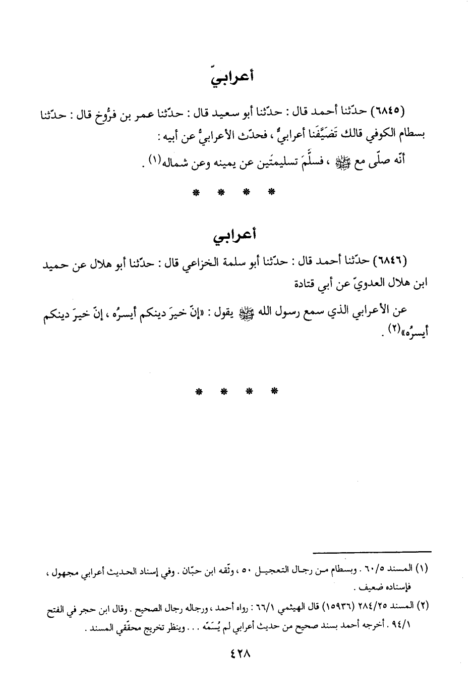 (١) المسند ٥/ ٦٠. وبسطام من رجال التعجيل ٥٠، وثقه ابن حبان. وفي إسناد الحديث أعرابي مجهول،