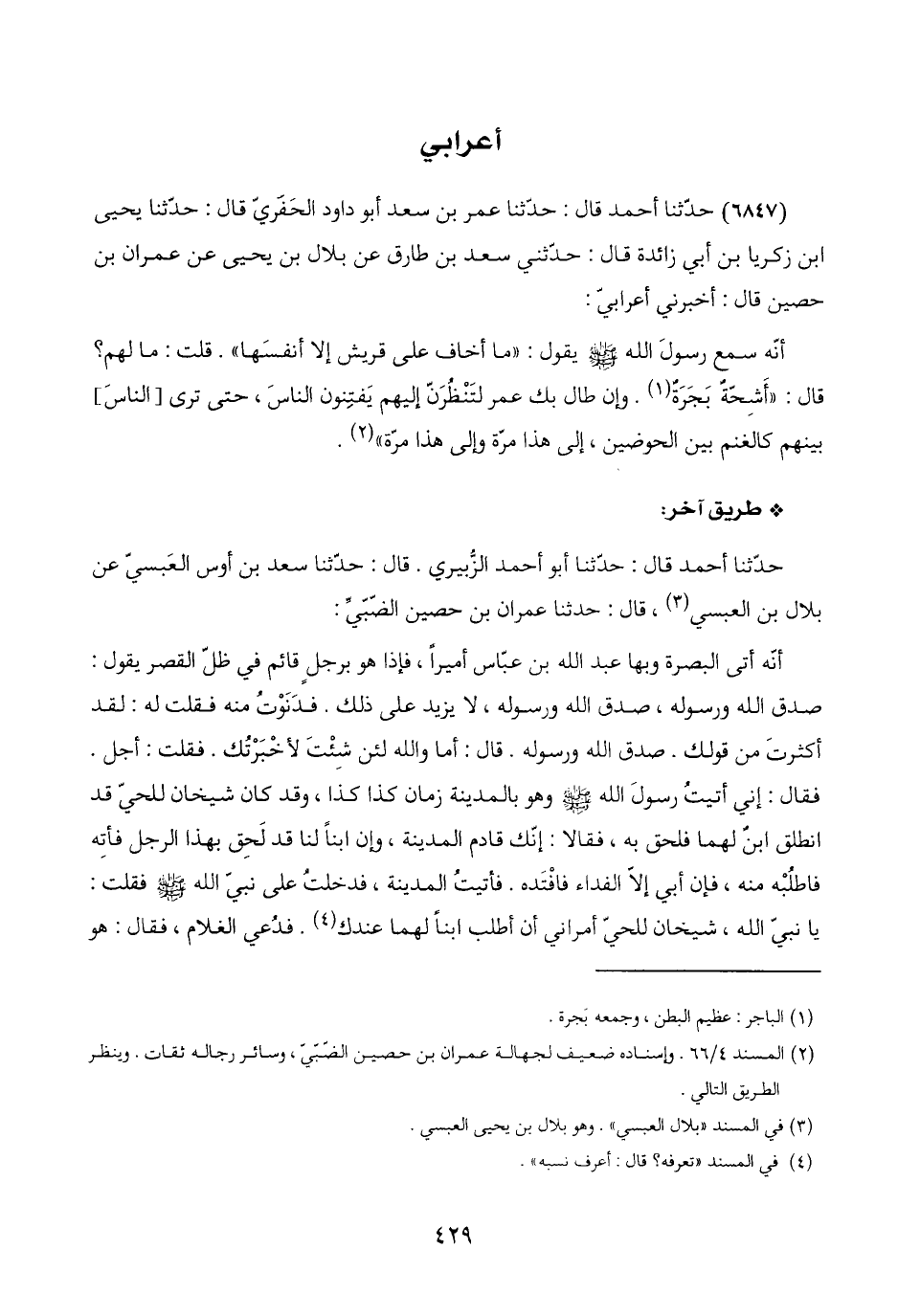 (٢) المسند ٤/ ٦٦. وإسناده ضعيف لجهالة عمران بن حصين الضَبَي، وسائر رجاله ثقات. وينظر