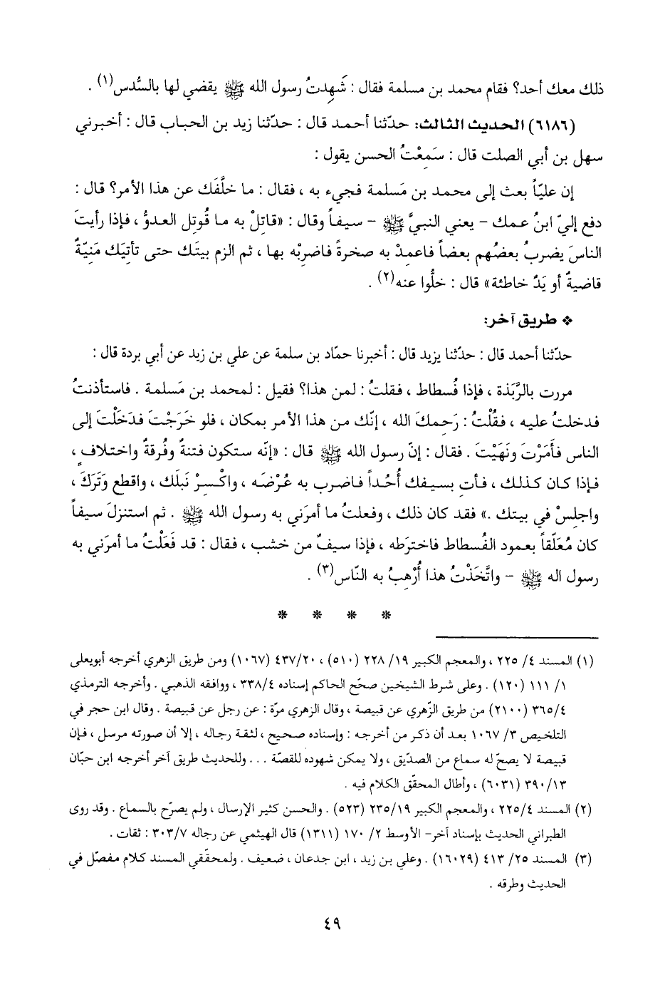 إنّ عليًّا بعث إلى محمد بن مَسلمة فجيء به، فقال: ما خلَّفَك عن هذا الأمر؟ قال: دفع إليّ ابنُ عمك - يعني النبيّ -صلى اللَّه عليه وسلم- سيفًا وقال: "قاتِلْ به ما قُوتِل العدوُّ، فإذا رأيتَ النّاسَ يضربُ بعضُهم بعضًا فاعمِدْ به صخرةً فاضرِبْه بها، ثم الزم بيتَك حتى تأتِيَك مَنِيّةٌ قاضيةٌ أو يَدٌ خاطئة" قال: خلُّوا عنه (٢).