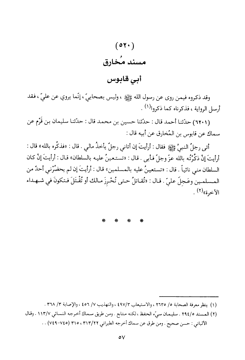 (٦٢٠١) حدّثنا أحمد قال: حدّثنا حسين بن محمد قال: حدّثنا سليمان بن قَرْم عن سماك عن قابوس بن المُخارق عن أبيه قال: