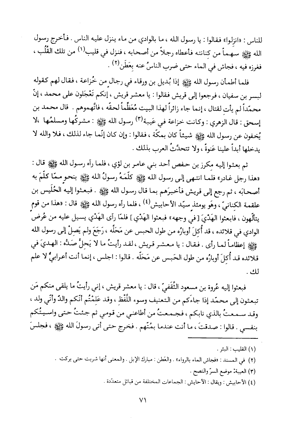 فبعثوا إليه عُروة بن مسعو الثَّقَفيّ، قال: يا معشر قريش، إني رأيتُ ما يلقى منكم مَن تبعثون إلى محمّد إذا جاءَكم من التعنيف وسوء اللَّفْظِ، وقد عَلِمْتُم أنكم والدٌ وأنّي ولد، وقد سمعتُ بالذي نابكم، فجمعتُ من أطاعني من قومي ثم جئتُ حتى واسيتُكم بنفسي. قالوا: صدقتَ، ما أنت عندما بمُتّهم. فخرج حتى أتى رسولَ اللَّه -صلى اللَّه عليه وسلم-، فجلسَ