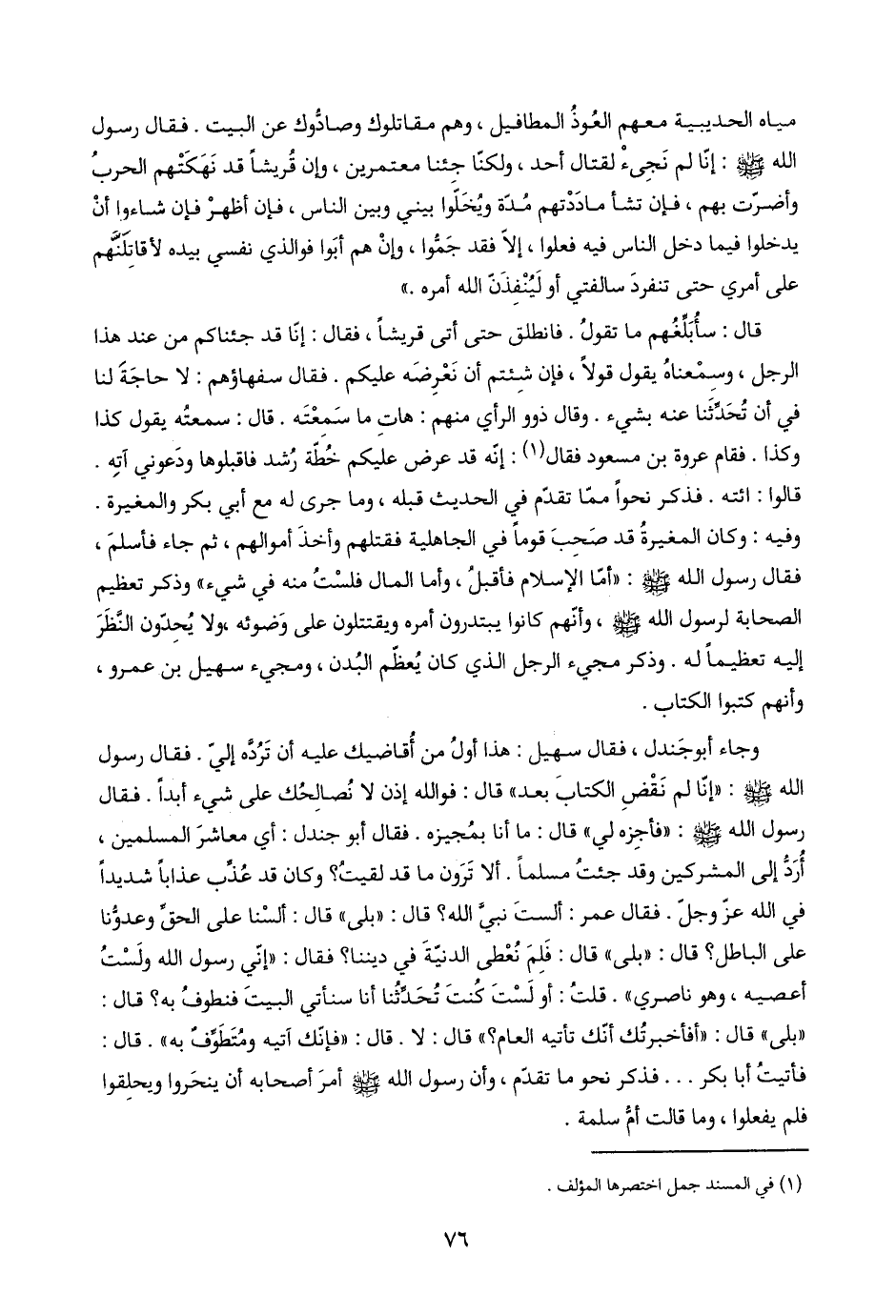 مياه الحديبية معهم العُوذُ المطافيل، وهم مقاتلوك وصادُّوك عن البيت. فقال رسول اللَّه -صلى اللَّه عليه وسلم-: إنّا لم نَجِىءْ لقتال أحد، ولكنّا جِئنا معتمرين، وإن قُريشًا قد نَهَكَتْهم الحربُ وأضرّت بهم، فإن تشأ مادَدْتهم مُدّة ويُخَلّوا بيني وبين النّاس، فإن أظهرْ فإن شاءوا أنْ يدخلوا فيما دخل النّاس فيه فعلوا، إلّا فقد جَمُّوا، وإنْ هم أبَوا فوالذي نفسي بيده لأقاتِلَنَّهم على أمري حتى تنفردَ سالفتي أو لَيُنْفِذَنّ اللَّه أمره".