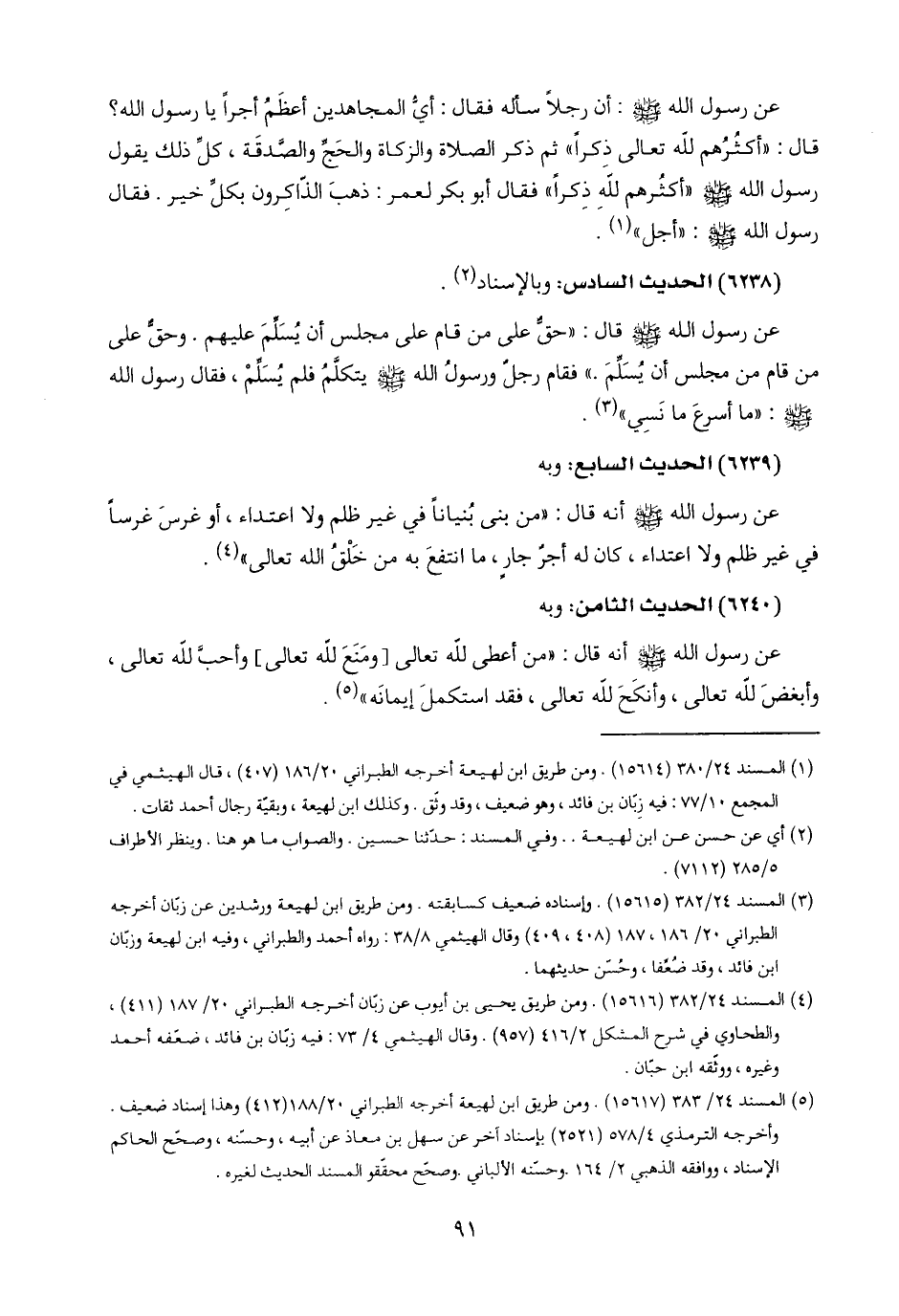 عن رسول اللَّه -صلى اللَّه عليه وسلم- أنّه قال: "من أعطى للَّه تعالى [ومَنَعَ للَّه تعالى] وأحبَّ للَّه تعالى، وأبغضَ للَّه تعالى، وأنكَحَ للَّه تعالى، فقد استكملَ إيمانَه" (٥).