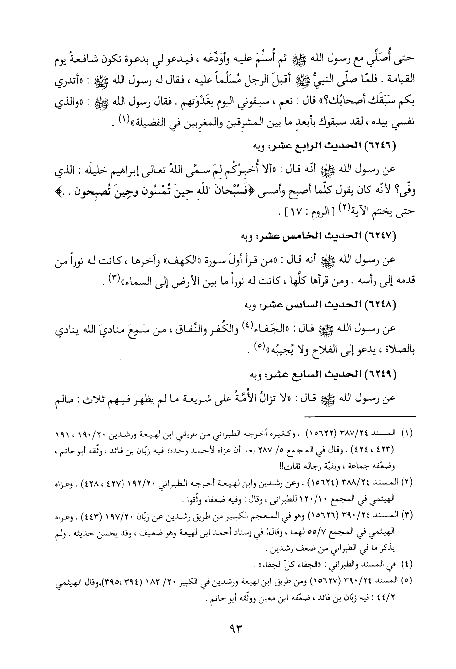 (٥) المسند ٢٤/ ٣٩٠ (١٥٦٢٧) ومن طريق ابن لهيعة ورشدين في الكبير ٢٠/ ١٨٣ (٣٩٤، ٣٩٥). وقال الهيثمي ٢/ ٤٤: فيه زبّان بن فائد، ضعّفه ابن معين ووثّقه أبو حاتم.
