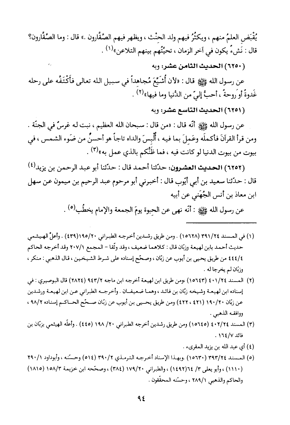 (٢) المسند ٢٤/ ٤٠١ (١٥٦٤٣)، ومن طريق ابن لهيعة أخرجه ابن ماجه ٢/ ٩٤٣ (٢٨٢٤) قال البوصيري: في إسناده ابن لهيعة وشيخه زبّان بن فائد، وهما ضعيفان. وأخرجه الطبراني عن ابن لهيعة ورشدين عن زبّان ٢٠/ ١٩٠ (٤٢١، ٤٢٢) ومن طريق يحيى بن أيوب عن زبّان صحّح الحاكم إسناده ٢/ ٩٨، ووافقه الذهبي.