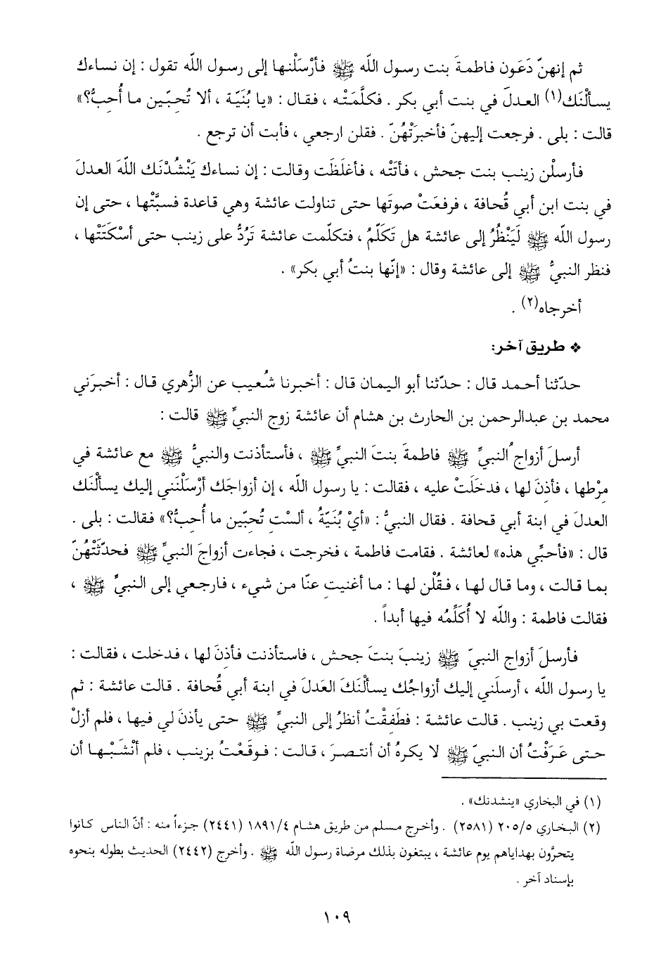 العدلَ في ابنة أبي قحافة. فقال النبيُّ: "أيْ بُنَيّةُ، ألسْتِ تُحِبّين ما أحِبُّ؟ " فقالت: بلى.