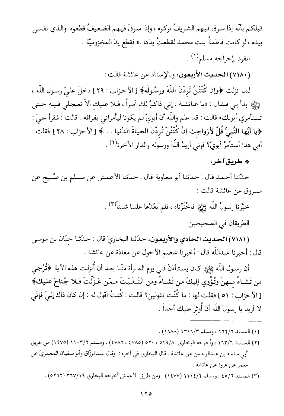 (٢) المسند ٦/ ١٦٣، وأخرجه البخاري ٨/ ٥١٩، ٥٢٠ (٤٧٨٥، ٤٧٨٦)، ومسلم ٢/ ١١٠٣ (١٤٧٥) من طريق