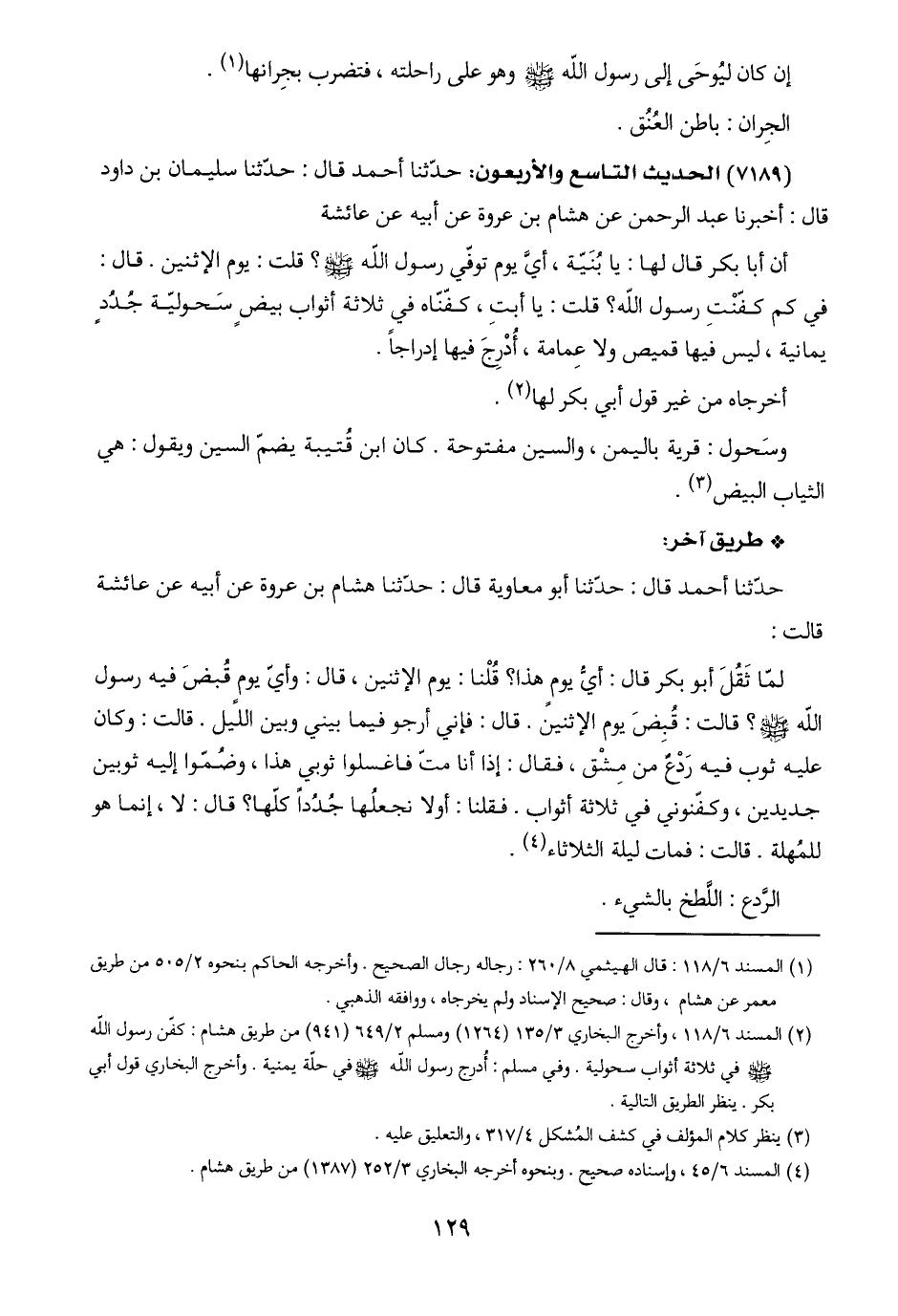 (٢) المسند ٦/ ١١٨، وأخرج البخاري ٣/ ١٣٥ (١٢٦٤) ومسلم ٢/ ٦٤٩ (٩٤١) من طريق هشام: كفّن رسول الله