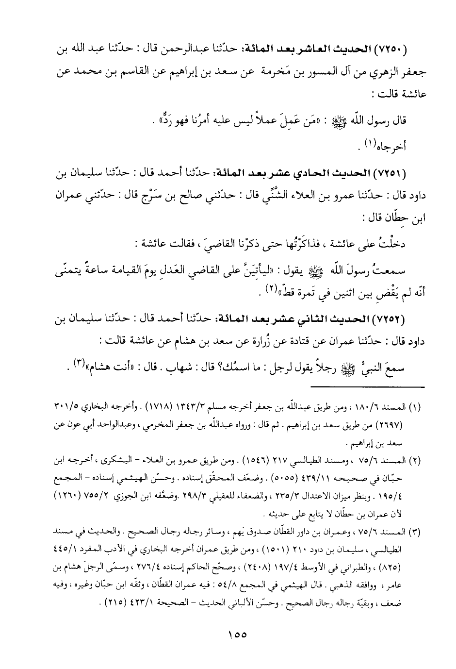 (٣) المسند ٦/ ٧٥، وعمران بن داور القطان صدوق يَهم، وسائر رجاله رجال الصحيح. والحديث في مسند