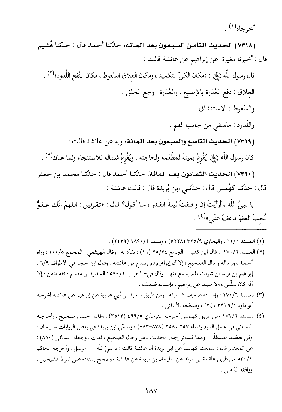 أحمد، ورجاله رجال الصحيح، إلا أن إبراهيم لم يسمع من عائشة. وقال ابن حجر في الأطراف ٩/ ٦: