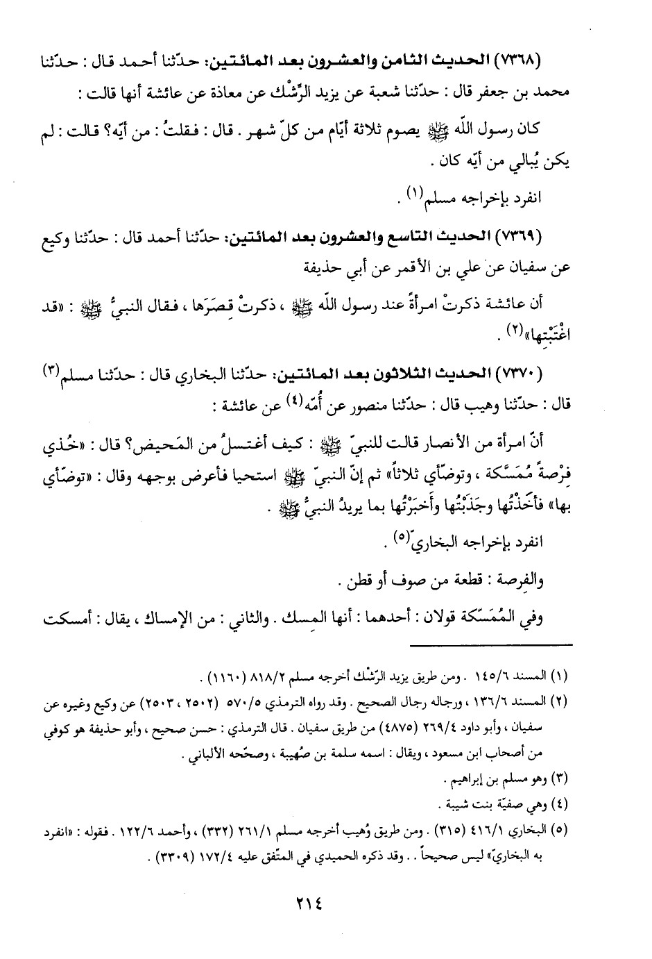 فِرْصةً مُمَسَّكة، وتوضّأي ثلاثًا" ثمَّ إنَّ النبيّ - صلى الله عليه وسلم - استحيا فأعرض بوجهه وقال: "توضّأي