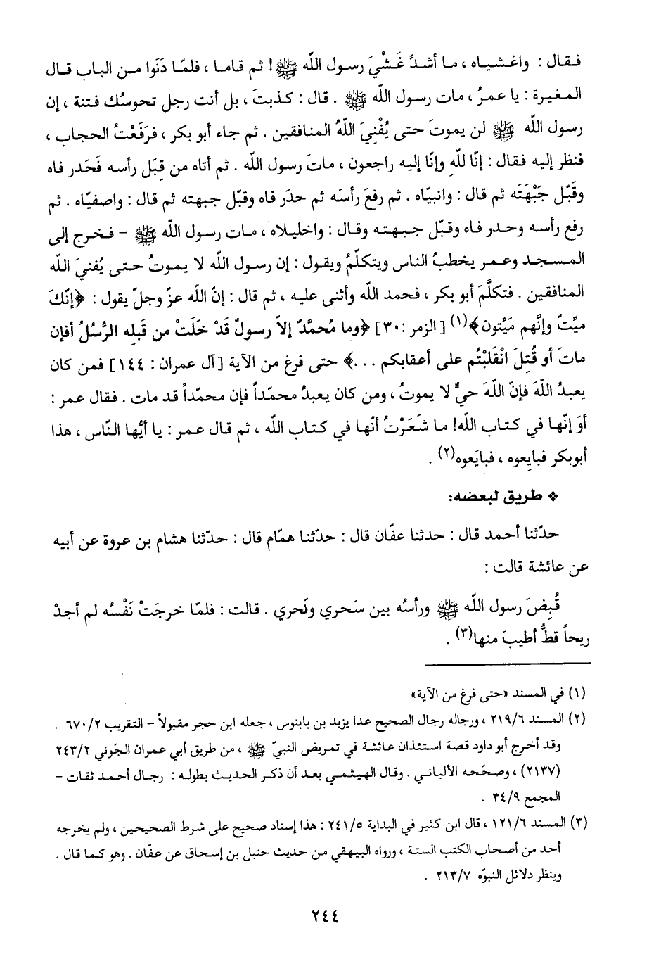 فنظر إليه فقال: إنّا للهِ وإنّا إليه راجعون، ماتَ رسول الله. ثمَّ أتاه من قِبَل رأسه فَحَدر فاه