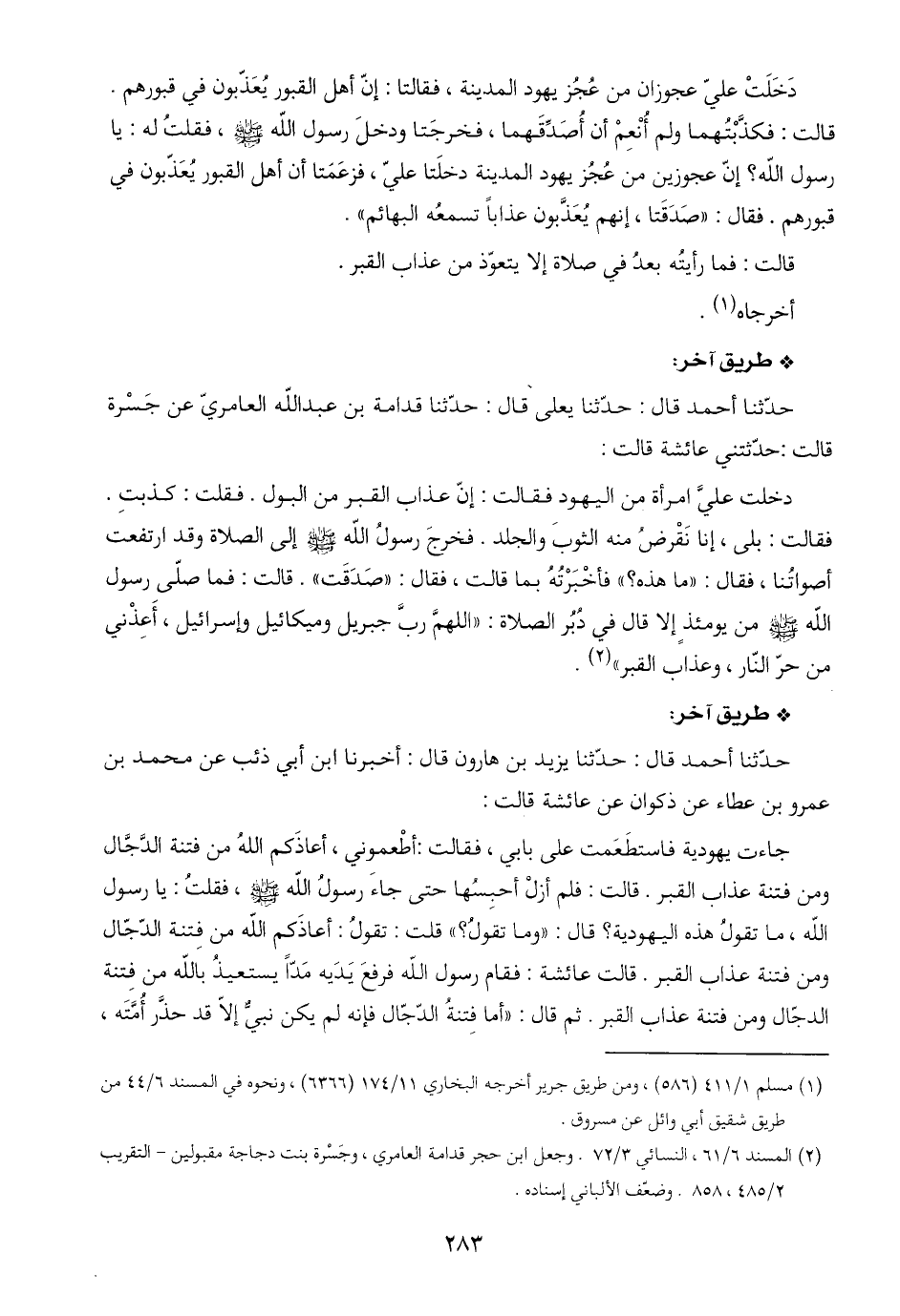 دَخَلَتْ عليّ عجوزان من عُجُز يهود المدينة، فقالتا: إنّ أهل القبور يُعَذّبون في قبورهم.