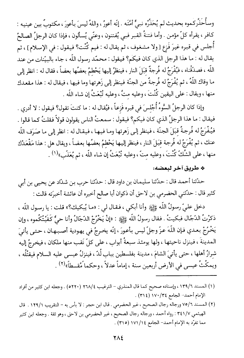(٢) المسند ٦/ ٧٥ ورجاله رجال الصحيح، غير الحضرمي. قال ابن حجر: لا بأس به - التقريب ١/ ١٢٩. قال