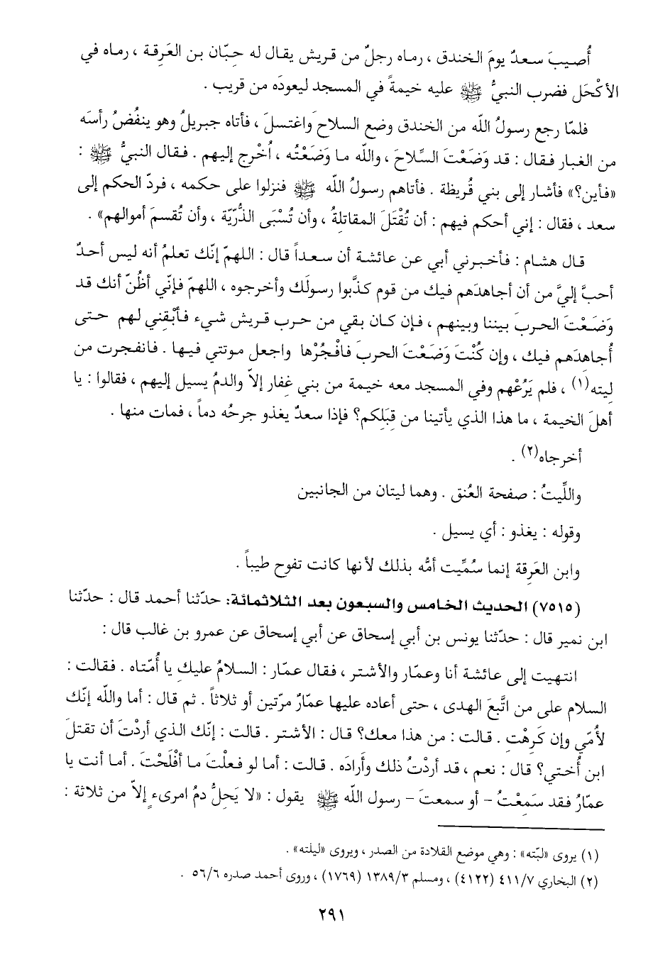 قال هشام: فأخبرني أبي عن عائشة أن سعداً قال: اللهمّ إنّك تعلمُ أنه ليس أحدٌ