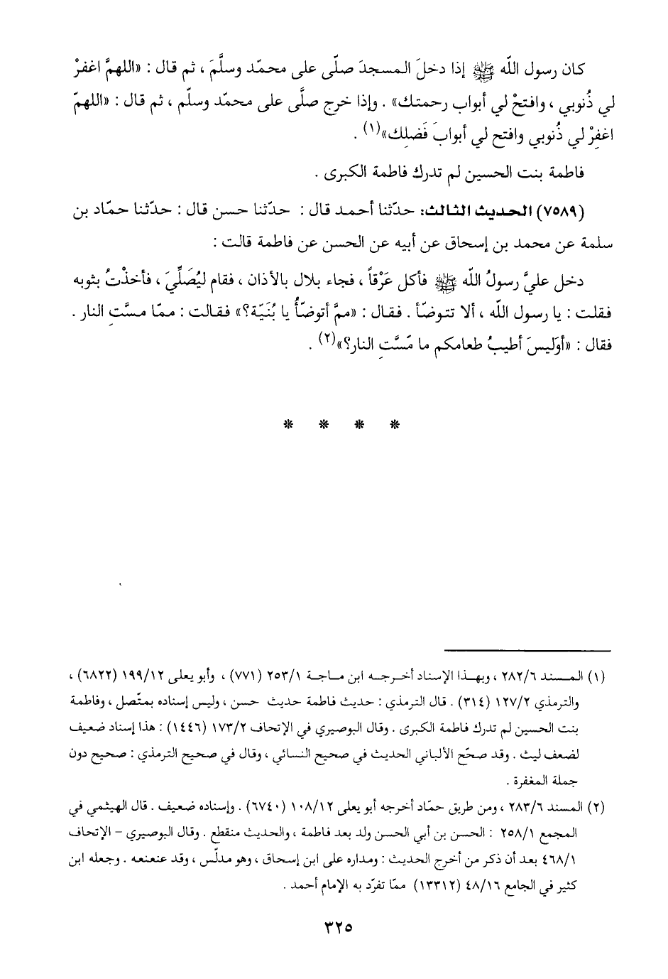 بنت الحسين لم تدرك فاطمة الكبرى. وقال البوصيري في الإتحاف ٢/ ١٧٣ (١٤٤٦): هذا إسناد ضعيف