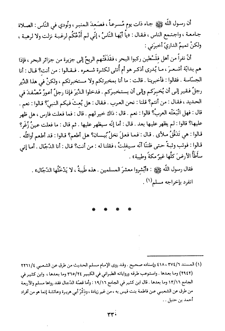 الجامع ١٦/ ١٣ وما بعدها. قال ابن كثير في الجامع ١٦/ ١٩: وأما قصَة الدّجال فقد رواها مسلم والأربعة
