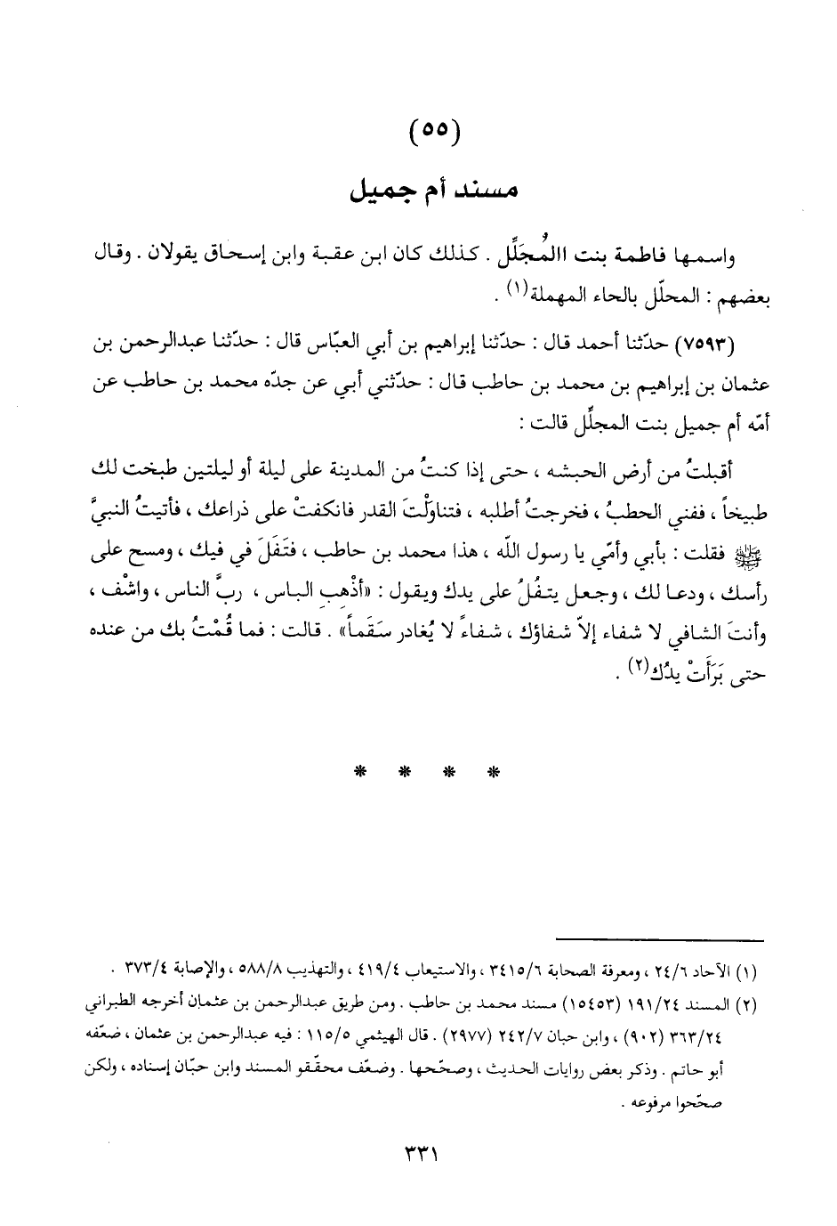 (٢) المسند ٢٤/ ١٩١ (١٥٤٥٣) مسند محمد بن حاطب. ومن طريق عبد الرحمن بن عثمان أخرجه الطبراني