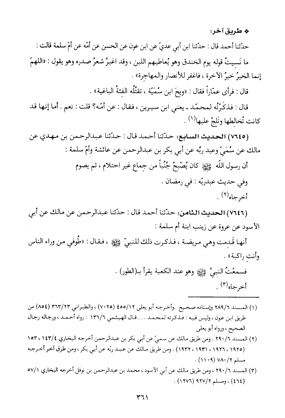 (٣) المسند ٦/ ٢٩٠، ومن طريق مالك عن أبي الأسود، محمد بن عبدالرحمن بن نوفل أخرجه البخاري ١/ ٥٧