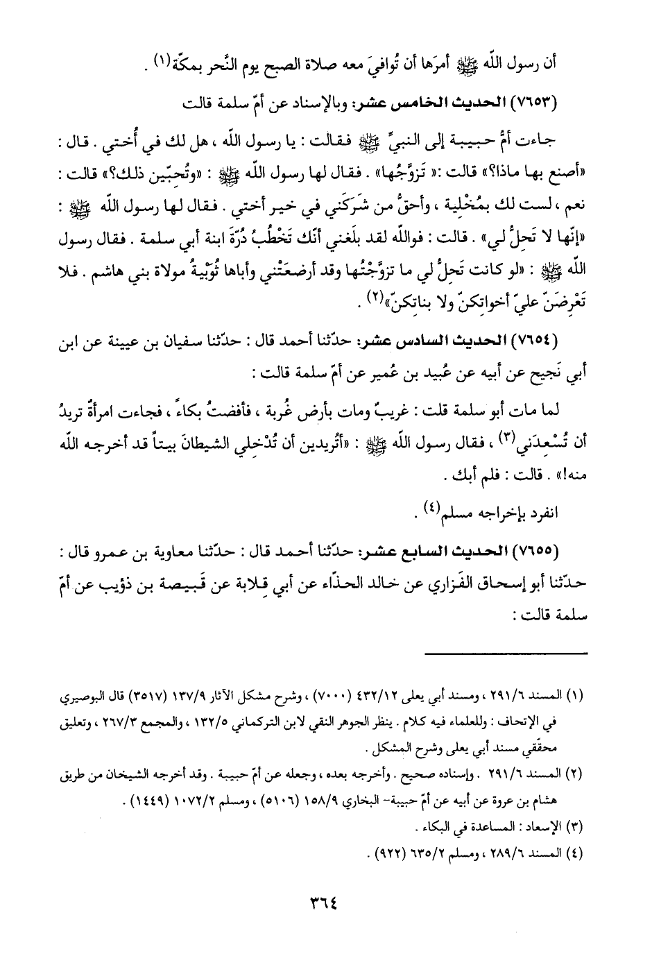 (٢) المسند ٦/ ٢٩١. وإسناده صحيح. وأخرجه بعده، وجعله عن أمّ حبيبة. وقد أخرجه الشيخان من طريق