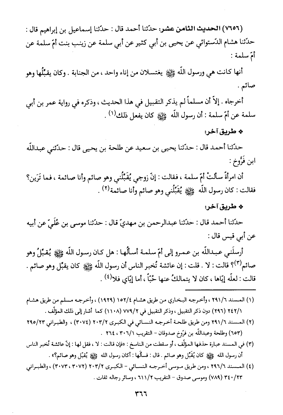 (٤) المسند ٦/ ٢٩٦، ومن طريق موسى أخرجه النسائي- الكبرى ٢/ ٢٠٣ (٣٠٧٢، ٣٠٧٣)، والطبراني