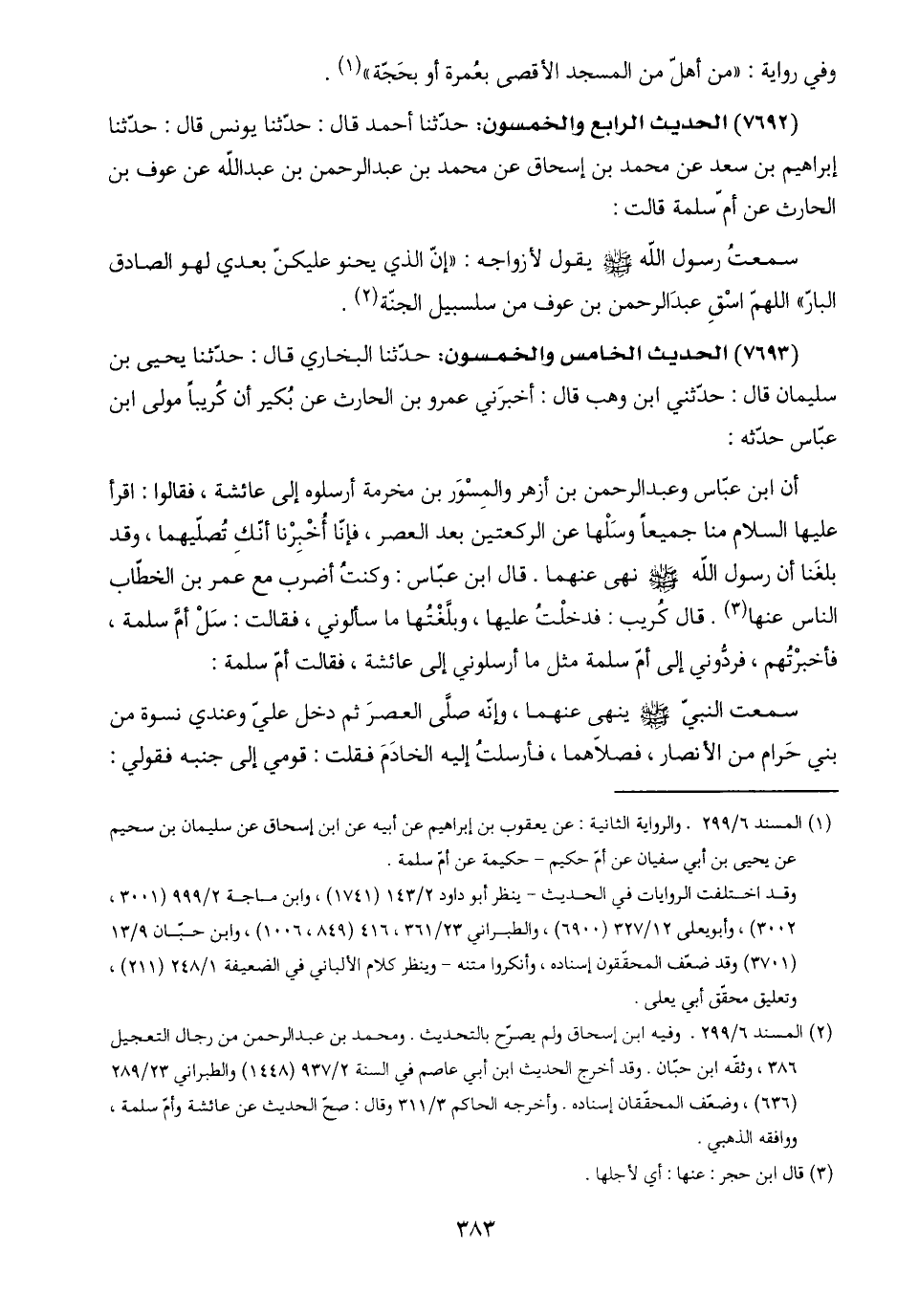 (١) المسند ٦/ ٢٩٩. والرواية الثانية: عن يعقوب بن إبراهيم عن أبيه عن ابن إسحاق عن سليمان بن سحيم