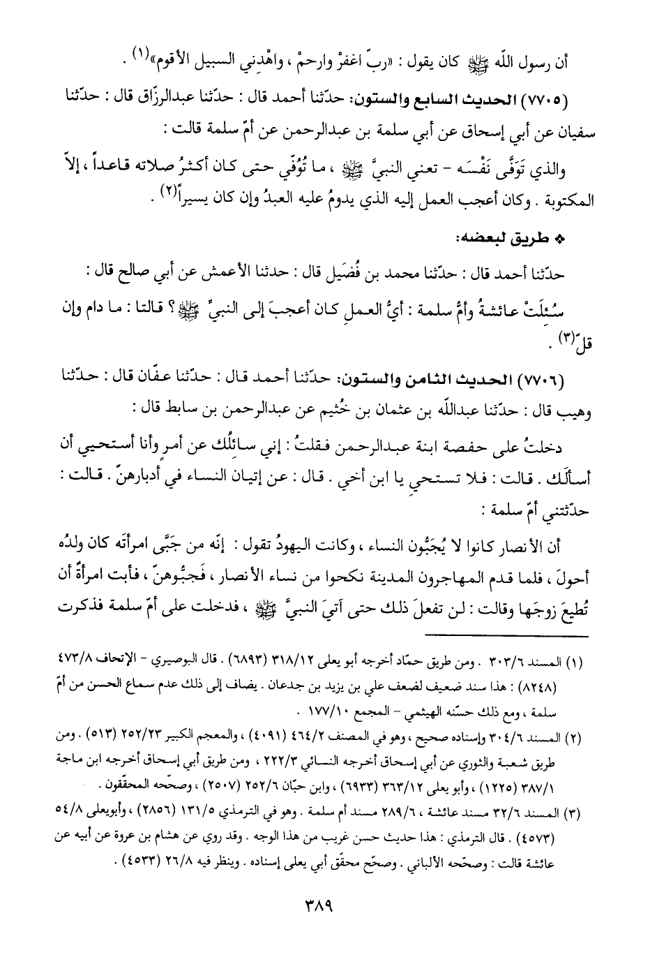 (٣) المسند ٦/ ٣٢ مسند عائشة، ٦/ ٢٨٩ مسند أم سلمة. وهو في الترمذي ٥/ ١٣١ (٢٨٥٦)، وابو يعلى ٨/ ٥٤