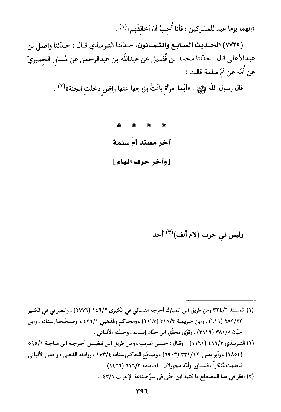 (١) المسند ٦/ ٣٢٤ ومن طريق ابن المبارك أخرجه النسائي في الكبرى ٢/ ١٤٦ (٢٧٧٦)، والطبراني في الكبير