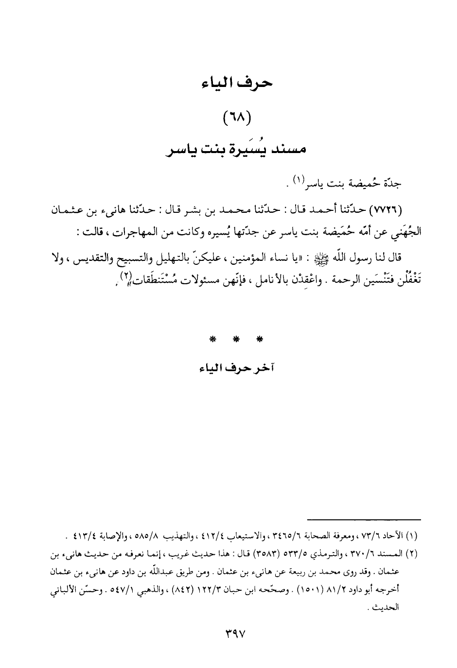 (٢) المسند ٦/ ٣٧٠، والترمذي ٥/ ٥٣٣ (٣٥٨٣) قال: هذا حديث غريب، إنما نعرفه من حديث هانىء بن
