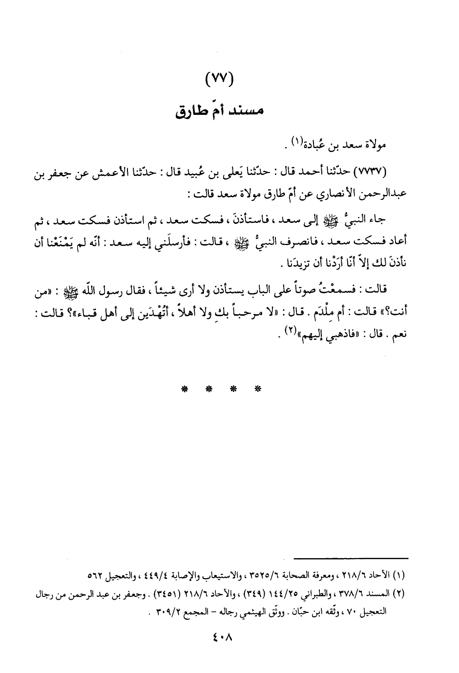 (٢) المسند ٦/ ٣٧٨، والطبراني ٢٥/ ١٤٤ (٣٤٩)، والآحاد ٦/ ٢١٨ (٣٤٥١). وجعفر بن عبد الرحمن من رجال