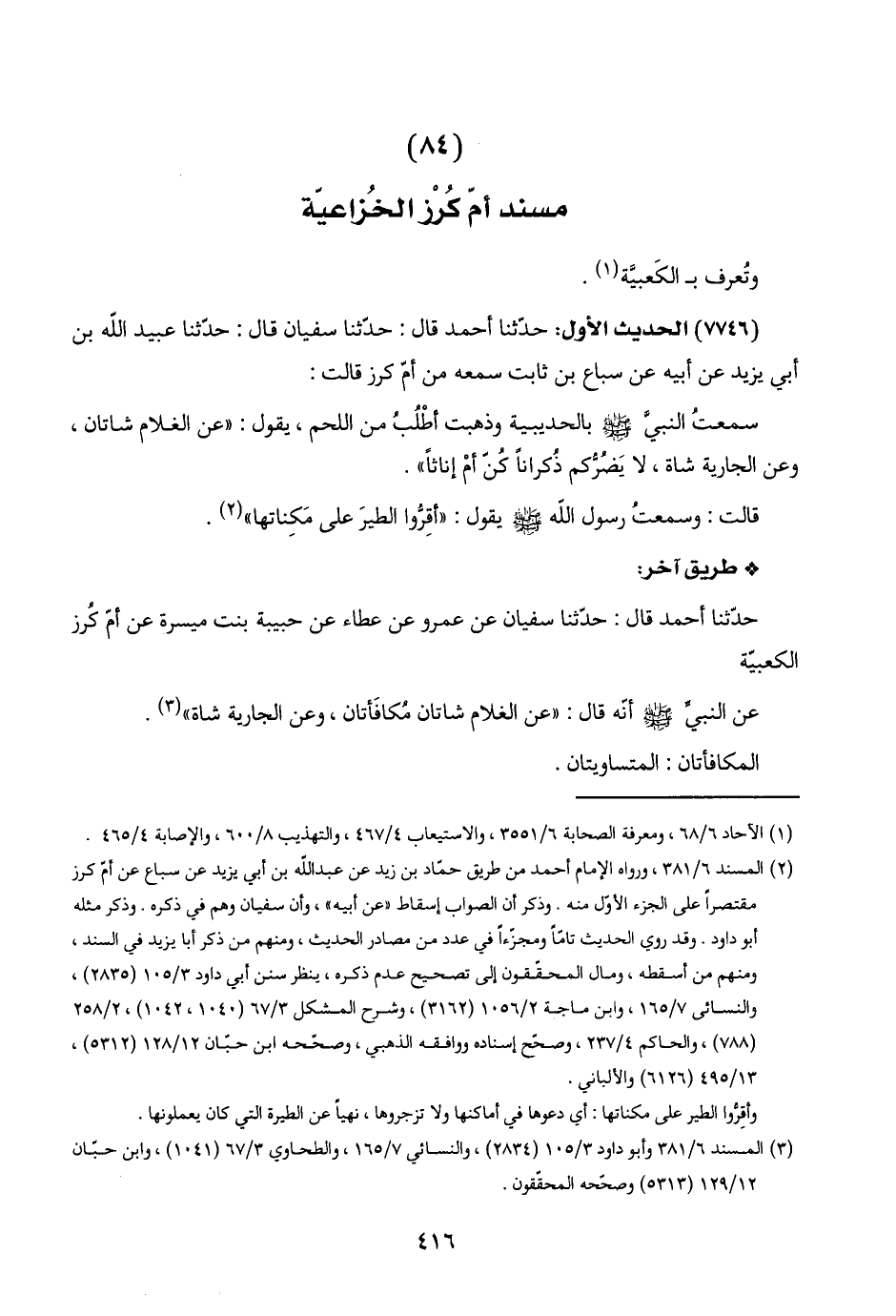 (٢) المسند ٦/ ٣٨١، ورواه الإمام أحمد من طريق حمّاد بن زيد عن عبد الله بن أبي يزبد عن سباع عن أمّ كرز