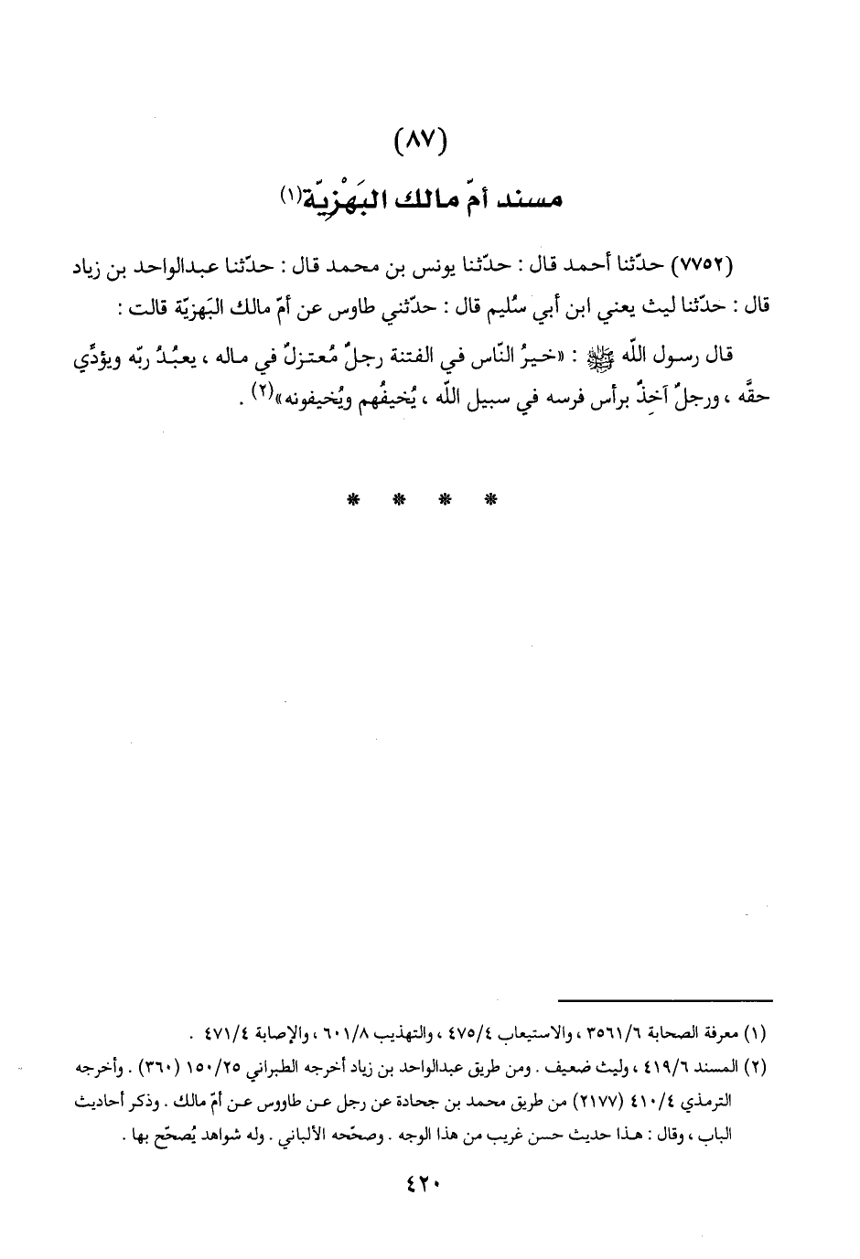 (٢) المسند ٦/ ٤١٩، وليث ضعيف. ومن طريق عبد الواحد بن زياد أخرجه الطبراني ٢٥/ ١٥٠ (٣٦٠). وأخرجه