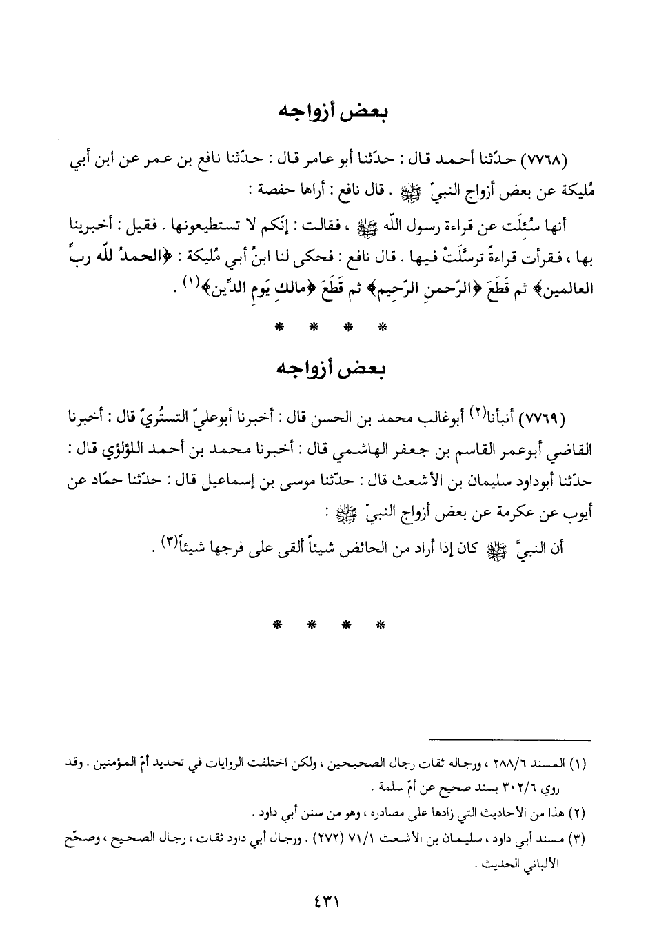 (١) المسند ٦/ ٢٨٨، ورجاله ثقات رجال الصحيحين، ولكن اختلفت الروايات في تحديد أمّ المؤمنين. وقد