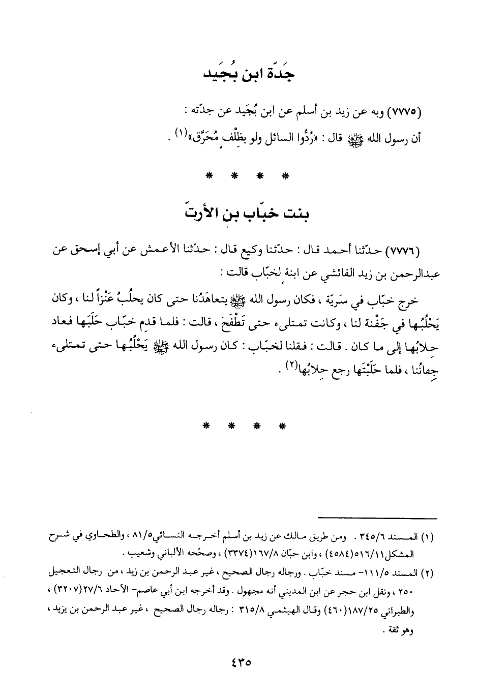 (١) المسند ٦/ ٣٤٥ - ومن طريق مالك عن زيد بن أسلم أخرجه النسائي ٥/ ٨١، والطحاوي في شرح