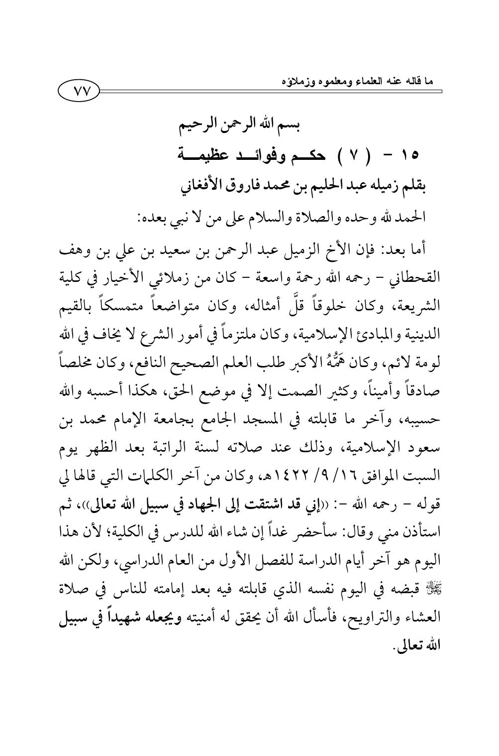 أما بعد: فإن الأخ الزميل عبد الرحمن بن سعيد بن علي بن وهف القحطاني - رحمه الله رحمة واسعة - كان من زملائي الأخيار في كلية الشريعة، وكان خلوقاً قلَّ أمثاله، وكان متواضعاً متمسكاً بالقيم الدينية والمبادئ الإسلامية، وكان ملتزماً في أمور الشرع لا يخاف في الله لومة لائم، وكان هَمُّهُ الأكبر طلب العلم الصحيح النافع، وكان مخلصاً صادقاً وأميناً، وكثير الصمت إلا في موضع الحق، هكذا أحسبه والله حسيبه، وآخر ما قابلته في المسجد الجامع بجامعة الإمام محمد بن سعود الإسلامية، وذلك عند صلاته لسنة الراتبة بعد الظهر يوم السبت الموافق 16/ 9/1422هـ، وكان من آخر الكلمات التي قالها لي قوله - رحمه الله -: ((إني قد اشتقت إلى الجهاد في سبيل الله تعالى))، ثم استأذن مني وقال: سأحضر غداً إن شاء الله للدرس في الكلية؛ لأن هذا اليوم هو آخر أيام الدراسة للفصل الأول من العام الدراسي، ولكن الله - سبحانه وتعالى - قبضه في اليوم نفسه الذي قابلته فيه بعد إمامته للناس في صلاة العشاء والتراويح، فأسأل الله أن يحقق له أمنيته ويجعله شهيداً في سبيل الله تعالى.
