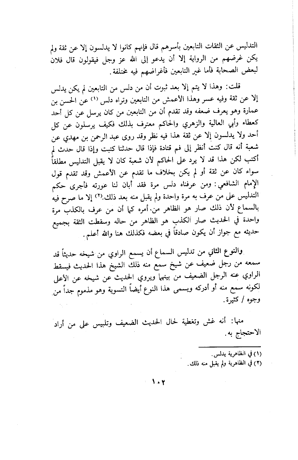 ومنها أنه يصرف على شيخه بتدليس لم يأذن له فيه وربما ألحق بشيخه وصمة التدليس إذا اطلع عليه أنه رواه عن الواسطة الضعيف ثم يوجد ساقط في هذه الرواية فيظن أن شيخه الذي أسقطه ودلس الحديث وليس كذلك ولا ريب في تضعيف من أكثر من هذا النوع وقد وقع فيه جماعة من الأئمة الكبار لكن يسيرا كالأعمش وسفيان الثوري حكاه عنهما الخطيب وروى عن قبيصة قال حدث سفيان الثوري يوما حديثا بدل فيه رجلا فقيل له يا أبا عبد الله فيه رجل فقال هذا سهل للطريق وممن أكثر منه بقية والوليد بن مسلم وتكلم فيهما من أجله قال ابن أبي حاتم في كتاب العلل سمعت أبي وذكر الحديث الذي رواه اسحاق ابن راهوية عن بقية حدثني أبو وهب الأسدي عن نافع عن ابن عمر حديث حتى تعرفوا عقدة رأيه فقال إن هذا الحديث له أمر قل من يفهمه روى هذا الحديث عبيد الله بن عمرو عن إسحاق بن أبي فروة عن نافع عن ابن عمر عن النبي صلى الله عليه وسلم وعبيد الله ابن عمرو كنيته أو وهب وهو أسدي فكناه بقية ونسبه إلى بني أسد لكي لا يفطن له حتى إذا ترك إسحاق بن أبي فروة من الوسط لا يهتدي له قال وكان بقية من أفعل الناس لهذا