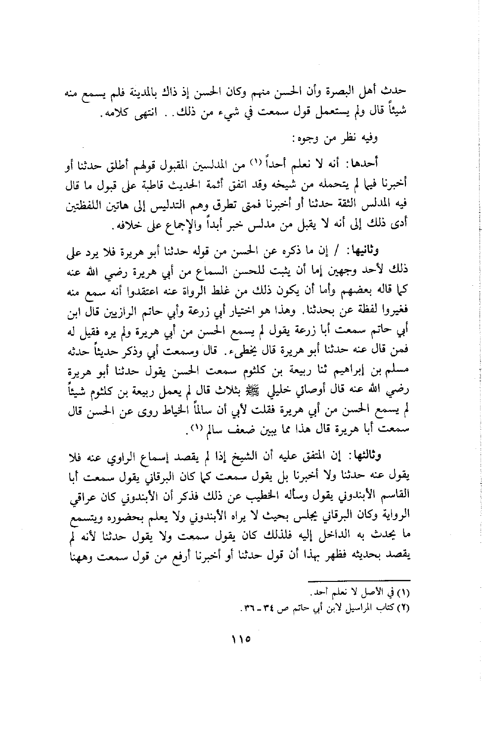 وثانيها إن ما ذكره عن الحسن من قوله حدثنا أبو هريرة فلا يرد على ذلك لأحد وجهين إما أن يثبت للحسن السماع من أبي هريرة رضي الله عنه كما قاله بعضهم وأما أن يكون ذلك من غلط الرواة عنه اعتقدوا أنه سمع منه فغيروا لفظة عن بحدثنا وهذا هو اختيار أبي زرعة وأبي حاتم الرازيين قال ابن أبي حاتم سمعت أبا زرعة يقول لم يسمع الحسن من أبي هريرة ولم يره فقيل له فمن قال عنه حدثنا أبو هريرة قال يخطىء قال وسمعت أبي وذكر حديثا حدثه مسلم بن إبراهيم ثنا ربيعة بن كلثوم سمعت الحسن يقول حدثنا أبو هريرة رضي الله عنه قال أوصاني خليلي صلى الله عليه وسلم بثلاث قال لم يعمل ربيعة بن كلثوم شيئا لم يسمع الحسن من أبي هريرة فقلت لأبي أن سالما الخياط روى عن الحسن قال سمعت أبا هريرة قال هذا مما بيبن ضعف سالم