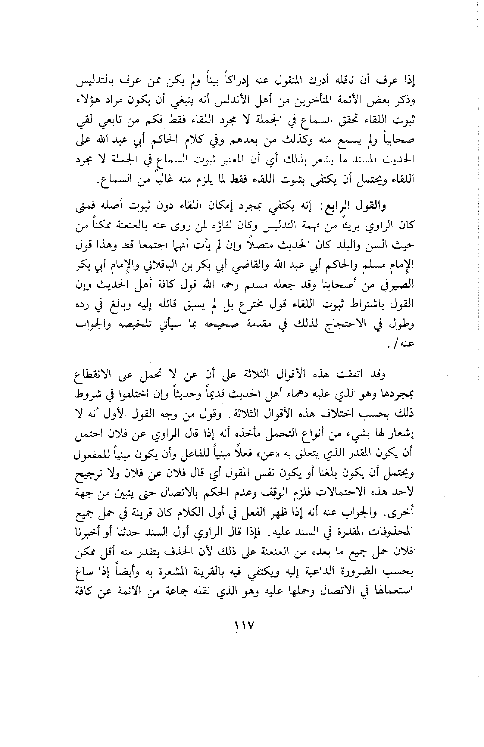 والقول الرابع إنه يكتفي بمجرد إمكان اللقاء دون ثبوت أصله فمتى كان الراوي بريئا من تهمة التدليس وكان لقاؤه لمن روى عنه بالعنعنة ممكنا من حيث السن والبلد كان الحديث متصلا وإن لم يأت أنهما اجتمعا قط وهذا قول الإمام مسلم والحاكم أبي عبد الله والقاضي أبي بكر بن الباقلاني والإمام أبي بكر الصيرفي من أصحابنا وقد جعله مسلم رحمه الله قول كافة أهل الحديث وإن القول باشتراط ثبوت اللقاء قول مخترع بل لم يسبق قائله إليه وبالغ في رده وطول في الاحتجاج لذلك في مقدمة صحيحه بما سيأتي تلخيصه والجواب عنه