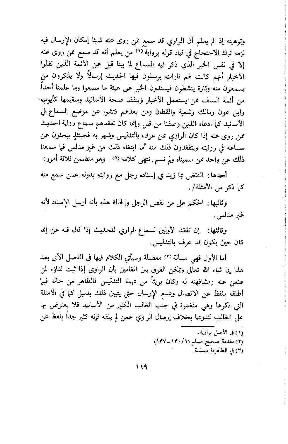 أما الأول فهي مسألة معضلة وسنأتي الكلام فيها في الفصل الآتي بعد هذا إن شاء الله تعالى ويمكن الفرق بين المقامين بأن الراوي إذا ثبت لقاؤه لمن عنعن عنه ومشافهته له وكان بريئا من تهمة التدليس فالظاهر من حاله فيما أطلقه بلفظ عن الاتصال وعدم الإرسال حتى يتبين ذلك بدليل كما في الأمثلة التي ذكرها وهي منغمرة في جنب الغالب الكثير من الأسانيد فلا يعترض بها على الغالب لندرتها بخلاف إرسال الراوي عمن لم يلقه فإنه كثير جدا بلفظ عن
