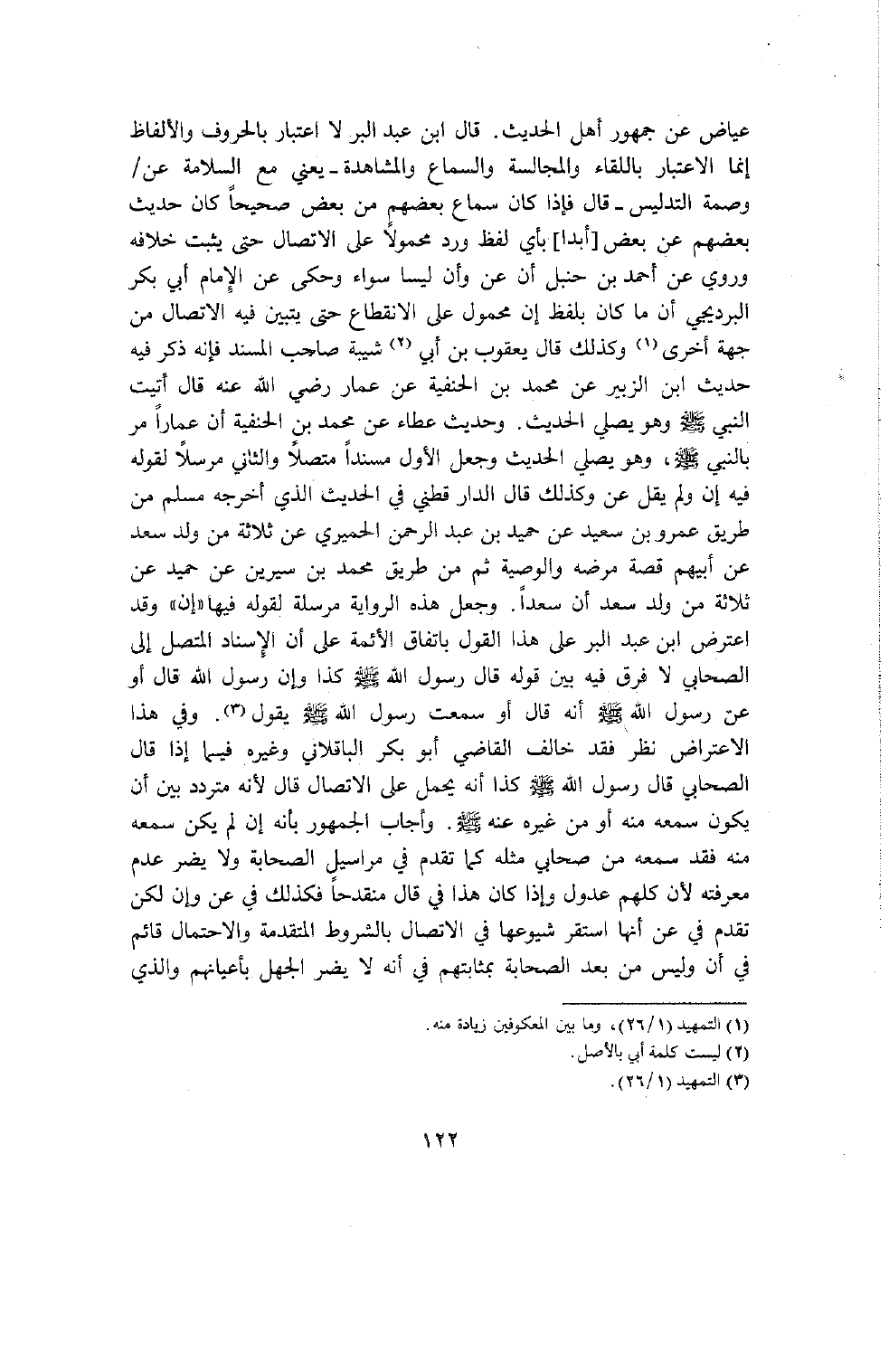 عياض عن جمهور أهل الحديث قال ابن عبد البر لا اعتبار بالحروف والألفاظ إنما الاعتبار باللقاء والمجالسة والسماع والمشاهدة يعني مع السلامة عن وصمة التدليس قال فإذا كان سماع بعضهم من بعض صحيحا كان حديث بعضهم عن بعض أبدا بأي لفظ ورد محمولا على الاتصال حتى يثبت خلافه وروي عن أحمد بن حنبل أن عن وأن ليسا سواء وحكى عن الإمام أبي بكر البرديجي أن ما كان بلفظ إن محمول على الانقطاع حتى يتبين فيه الاتصال من جهة أخرى وكذلك قال يعقوب بن أبي شيبة صاحب المسند فإنه ذكر فيه حديث ابن الزبير عن محمد بن الحنفية عن عمار رضي الله عنه قال أتيت النبي صلى الله عليه وسلم وهو يصلي الحديث وحديث عطاء عن محمد بن الحنفية أن عمارا مر بالنبي صلى الله عليه سلم وهو يصلي الحديث وجعل الأول مسندا متصلا والثاني مرسلا لقوله فيه إن ولم يقل عن وكذلك قال الدارقطني في الحديث الذي أخرجه مسلم من طريق عمرو بن سعيد عن حميد بن عبد الرحمن الحميري عن ثلاثة من ولد سعد عن أبيهم قصة مرضه والوصية ثم من طريق محمد بن سيرين عن حميد عن ثلاثة من ولد سعد أن سعدا وجعل هذه الرواية مرسلة لقوله فيها إن وقد اعترض ابن عبد البر على هذا القول باتفاق الأئمة على أن الإسناد المتصل إلى الصحابي لا فرق فيه بين قوله قال رسول الله صلى الله عليه وسلم كذا وإن رسول الله قال أو عن رسول الله صلى الله عليه وسلم أنه قال أو سمعت رسول الله صلى الله عليه وسلم يقول وفي هذا الاعتراض نظر فقد خالف القاضي أبو بكر الباقلاني وغيره فيما إذا قال الصحابي قال رسول الله صلى الله عليه وسلم كذا أنه يحمل على الاتصال قال لأنه متردد بين أن يكون سمعه منه أو من غيره عنه صلى الله عليه وسلم وأجاب الجمهور بأنه إن لم يكن سمعه منه فقد سمعه من صحابي مثله كما تقدم في مراسيل الصحابة ولا يضر عدم معرفته لأن كلهم عدول وإذا كان هذا في قال منقدحا فكذلك في عن وإن لكن تقدم في عن أنها استقر شيوعها في الاتصال بالشروط المتقدمة والاحتمال قائم في أن وليس من بعد الصحابة بمثابتهم في أنه لا يضر الجهل بأعيانهم والذي