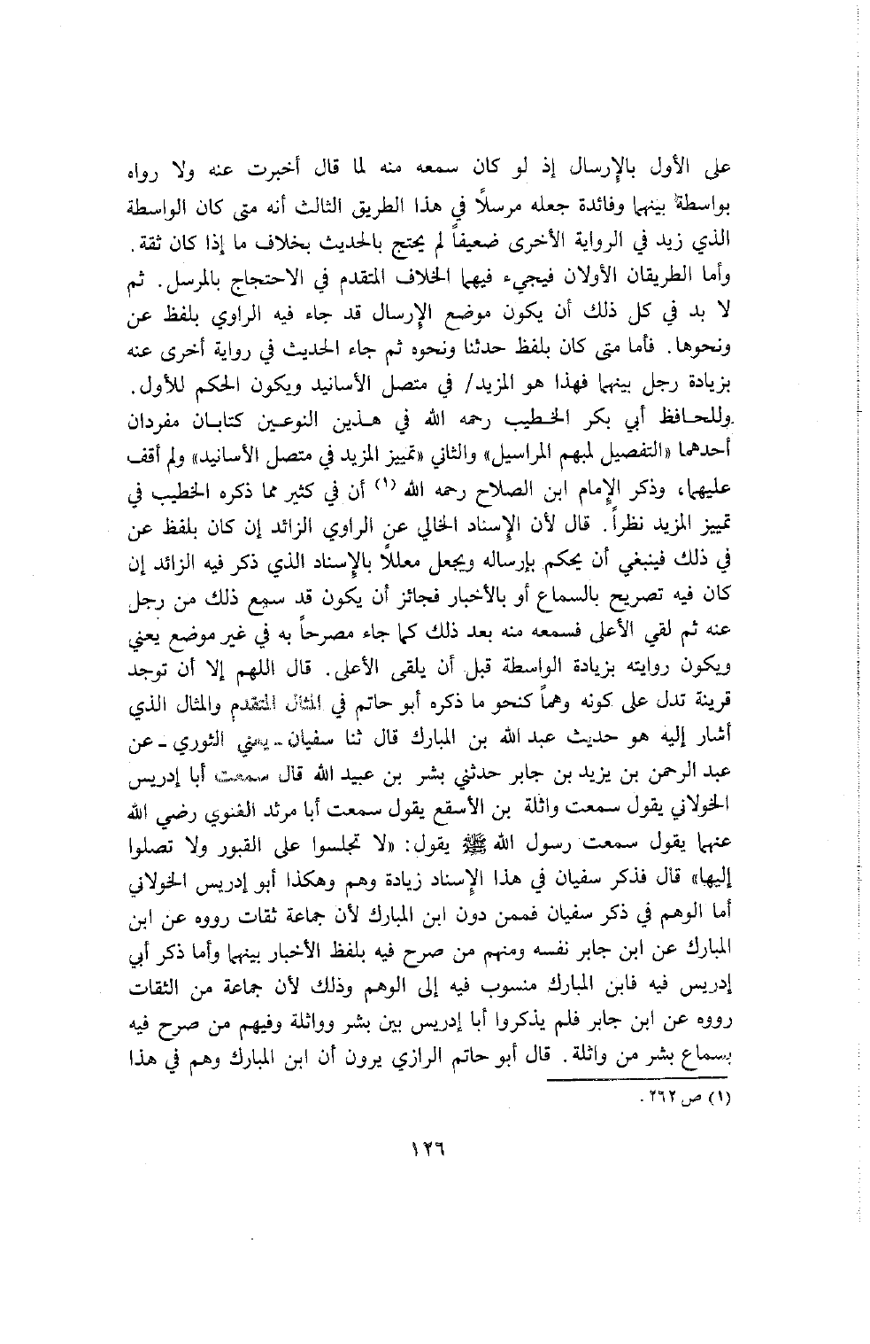 على الأول بالإرسال إذ لو كان سمعه منه لما قال أخبرت عنه ولا رواه بواسطة بينهما وفائدة جعله مرسلا في هذا الطريق الثالث أنه متى كان الواسطة الذي زيد في الرواية الأخرى ضعيفا لم يحتج بالحديث بخلاف ما إذا كان ثقة وأما الطريقان الأولان فيجيء فيهما الخلاف المتقدم في الاحتجاج بالمرسل ثم لا بد في كل ذلك أن يكون موضع الإرسال قد جاء فيه الراوي بلفظ عن ونحوها فأما متى كان بلفظ حدثنا ونحوه ثم جاء الحديث في رواية أخرى عنه بزيادة رجل بينهما فهذا هو المزيد في متصل الأسانيد ويكون الحكم للأول وللحافظ أبي بكر الخطيب رحمه الله في هذين النوعين كتابان مفردان أحدهما التفصيل لمبهم المراسيل والثاني تمييز المزيد في متصل الأسانيد ولم أقف عليهما وذكر الإمام ابن الصلاح رحمه الله أن في كثير مما ذكره الخطيب في تمييز المزيد نظرا قال لأن الإسناد الخالي عن الراوي الزائد إن كان بلفظ عن في ذلك فينبغي أن يحكم بإرساله ويجعل معللا بالإسناد الذي ذكر فيه الزائد إن كان فيه تصريح بالسماع أو بالأخبار فجائز أن يكون قد سمع ذلك من رجل عنه ثم لقي الأعلى فسمعه منه بعد ذلك كما جاء مصرحا به في غير موضع يعني ويكون روايته بزيادة الواسطة قبل أن يلقى الأعلى قال اللهم إلا أن توجد قرينة تدل على كونه وهما كنحو ما ذكره أبو حاتم في المثال المتقدم والمثال الذي أشار إليه هو حديث عبد الله بن المبارك قال ثنا سفيان يعني الثوري عن عبد الرحمن بن يزيد بن جابر حدثني بشر بن عبيد الله قال سمعت أبا إدريس الخولاني يقول سمعت واثلة بن الأسقع يقول سمعت أبا مرثد الغنوي رضي الله عنهما يقول سمعت رسول الله صلى الله عليه وسلم يقول لا تجلسوا على القبور ولا تصلوا إليها قال فذكر سفيان في هذا الإسناد زيادة وهم هكذا أبو إدريس الخولاني أما الوهم في ذكر سفيان فممن دون ابن المبارك لأن جماعة ثقات رووه عن ابن المبارك عن ابن جابر نفسه ومنهم من صرح فيه بلفظ الأخبار بينهما وأما ذكر أبي إدريس فيه فابن المبارك منسوب فيه إلى الوهم وذلك لأن جماعة من الثقات رووه عن ابن جابر فلم يذكروا أبا إدريس بين بشر وواثلة وفيهم من صرح فيه بسماع بشر من واثلة قال أبو حاتم الرازي يرون أن ابن المبارك وهم في هذا