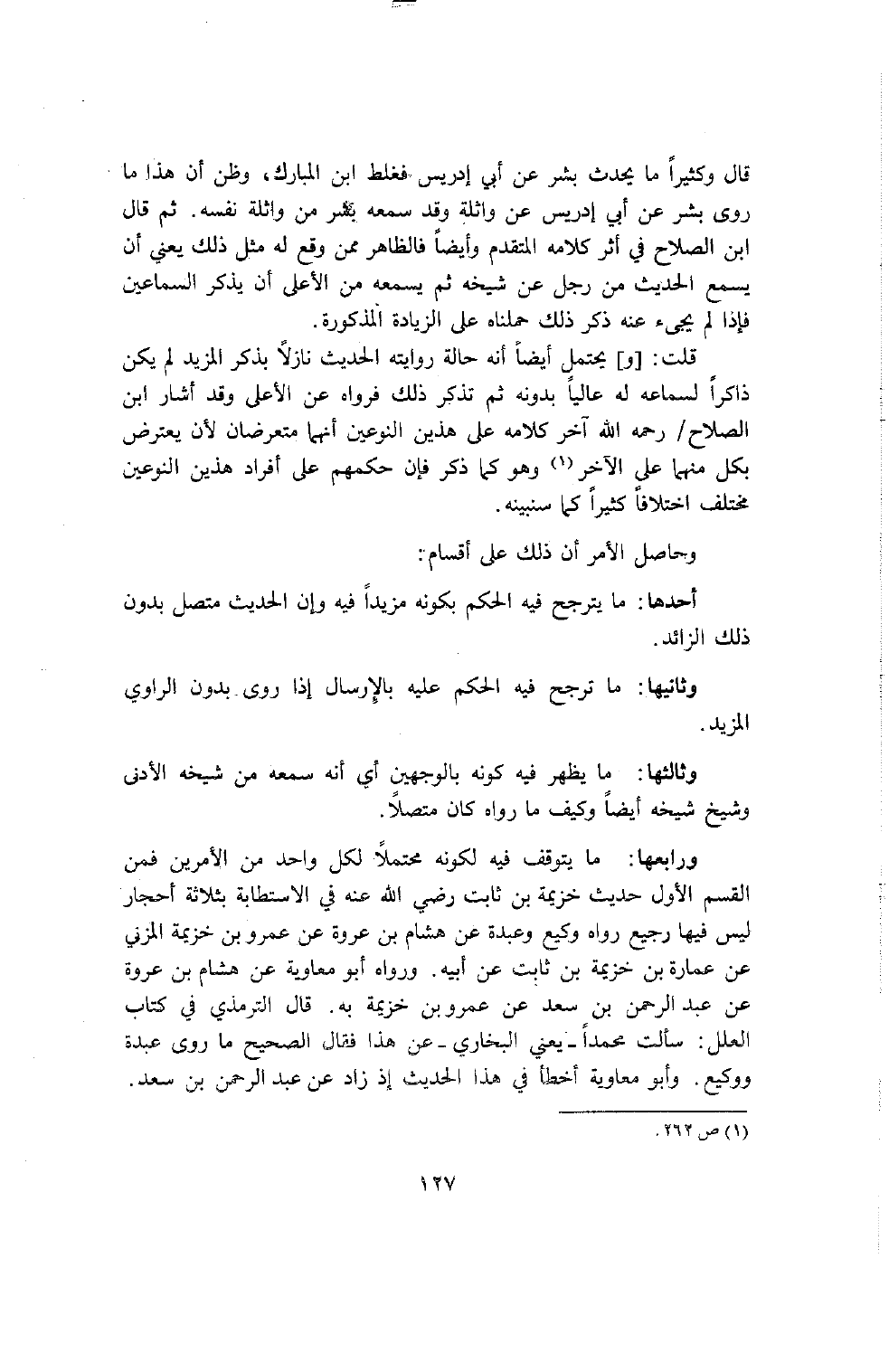 ورابعها ما يتوقف فيه لكونه محتملا لكل واحد من الأمرين فمن القسم الأول حديث خزيمة بن ثابت رضي الله عنه في الاستطابة بثلاثة أحجار ليس فيها رجيع رواه وكيع وعبدة عن هشام بن عروة عن عمرو بن خزيمة المزني عن عمارة بن خزيمة بن ثابت عن أبيه ورواه أبو معاوية عن هشام بن عروة عن عبد الرحمن بن سعد عن عمرو بن خزيمة به قال الترمذي في كتاب العلل سألت محمدا يعني البخاري عن هذا فقال الصحيح ما روى عبدة ووكيع وأبو معاوية أخطأ في هذا الحديث إذ زاد عن عبد الرحمن بن سعد
