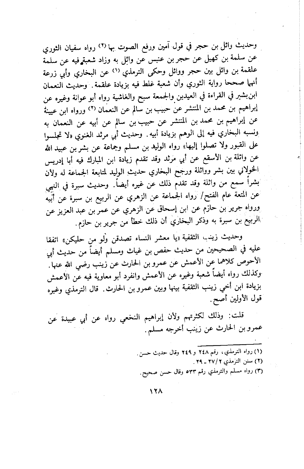 وحديث زينب الثقفية يا معشر النساء تصدقن ولو من حليكن اتفقا عليه في الصحيحين من حديث حفص بن غياث ومسلم أيضا من حديث أبي الأحوص كلاهما عن الأعمش عن عمرو بن الحارث عن زينب رضي الله عنها وكذلك رواه أيضا شعبة وغيره عن الأعمش وانفرد أبو معاوية فيه عن الأعمش بزيادة ابن أخي زينب الثقفية بينها وبين عمرو بن الحارث قال الترمذي وغيره قول الأولين أصح
