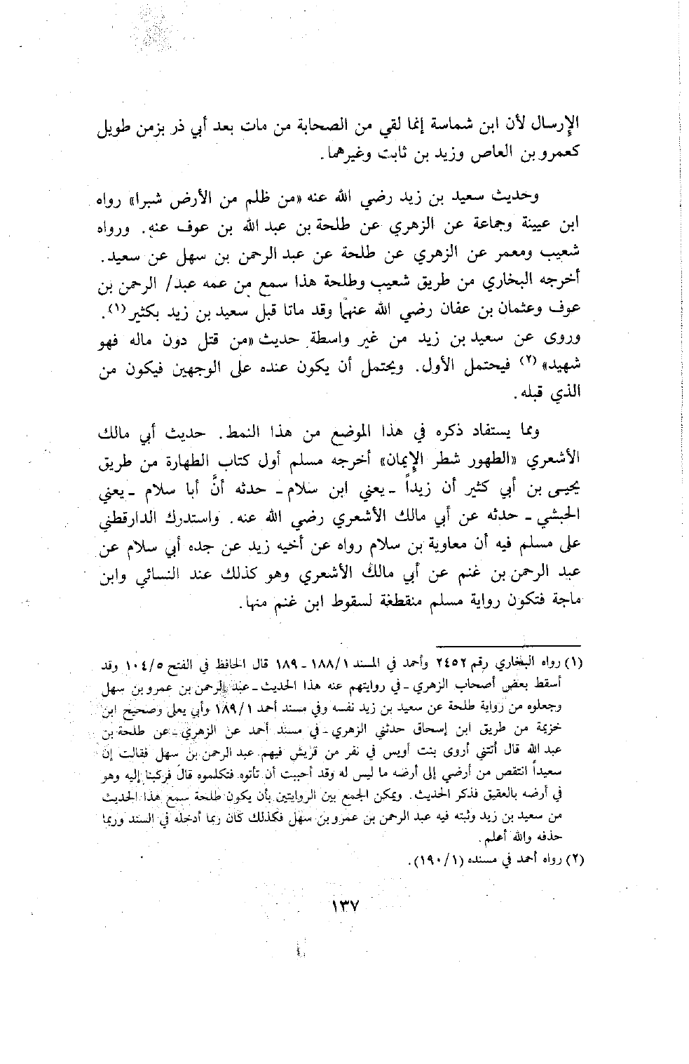 وحديث سعيد بن زيد رضي الله عنه من ظلم من الأرض شبرا رواه ابن عيينة وجماعة عن الزهري عن طلحة بن عبد الله بن عوف عنه ورواه شعيب ومعمر عن الزهري عن طلحة عن عبد الرحمن بن سهل عن سعيد أخرجه البخاري من طريق شعيب وطلحة هذا سمع من عمه عبد الرحمن بن عوف وعثمان بن عفان رضي الله عنهما وقد ماتا قبل سعيد بن زيد بكثير وروى عن سعيد بن زيد من غير واسطة حديث من قتل دون ماله فهو شهيد فيحتمل الأول ويحتمل ان يكون عنده على الوجهين فيكون من الذي قبله